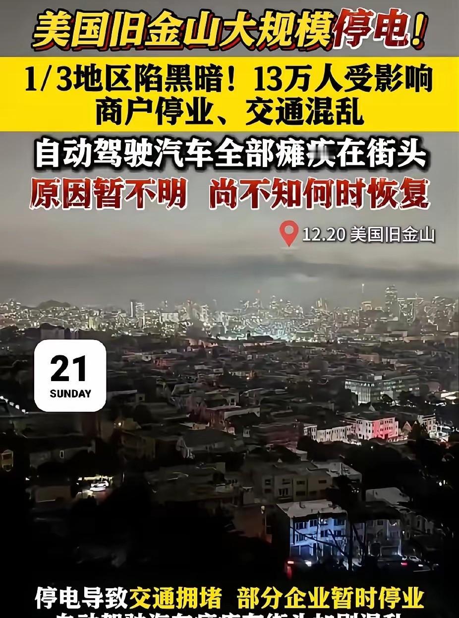 继“南京导航失灵”后,美国旧金山电网突然断电,上千辆无人车直接停马路上动不了,商家歇业路面乱套。两回事时间相隔不久,影响超大,但具体为什么到现在都没查清楚。 有专家怀疑可能是信号被恶意干扰,甚至说不排除有人故意搞事,毕竟卫星导航和电网都是国计民生的关键设施。现在各国都开始紧张了,据说有的在研究新定位技术,有的加强电网防护系统,生怕再出岔子。 这事到现在没个结果,也不知道下回会不会轮到自己住的城市出问题,总之科技越先进,隐患好像也越多。