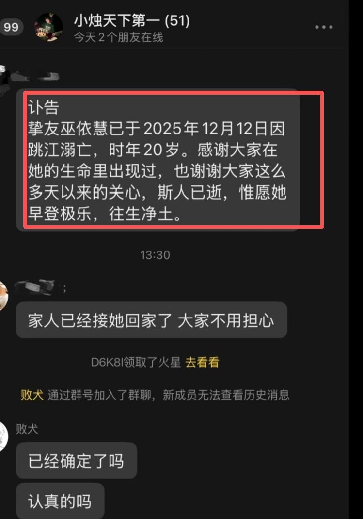 20岁主播巫依慧跳江离世,镜头前的阳光竟是抑郁症的伪装。 刚看到这则讣告时,心里咯噔一下——那个在视频里笑得眉眼弯弯、看着浑身是劲的广西姑娘,竟在12月12日选择跳江结束了生命。 她是个小主播,粉丝才五千多,却全是一路陪着她的铁粉。镜头里的她永远开朗,能把平凡的生活过得热热闹闹,甚至还成了一位网友的“精神支柱”——这位网友说自己情绪差到一天只吃一顿饭,看她的视频才觉得有力量。 可谁能想到,这份阳光全是装的。现实里的巫依慧被抑郁症缠了很久,难受时会靠自残发泄,却还反过来劝网友“要好好的,别像我一样困在黑暗里”。今年4月和网友相识后,两人从线上聊到线下,6月见面时她还送了对方一束花,小心翼翼地试探着想要一份感情,可这份期待最终没有得到明确回应。 那之后,她就渐渐失联了。直到12月16日,粉丝群里的讣告传来,大家才知道这个笑着给别人递光的女孩,自己却没能走出深渊。她的嫂子也证实了噩耗,说家人早就陪她治过抑郁,却还是没能留住她。 现在她的账号已经设为私密,粉丝们只能在旧视频下留言悼念。20岁,本该是刚要拥抱世界的年纪,她却被心里的黑洞吞了进去。 其实很多时候,那些笑着说“我没事”的人,可能正在熬着最难的时刻。别把抑郁当成“矫情”,也别忽略身边人的情绪求救,也许一句关心,就能拉住一个快要走散的人。愿巫依慧在另一个世界,能真的快乐起来。