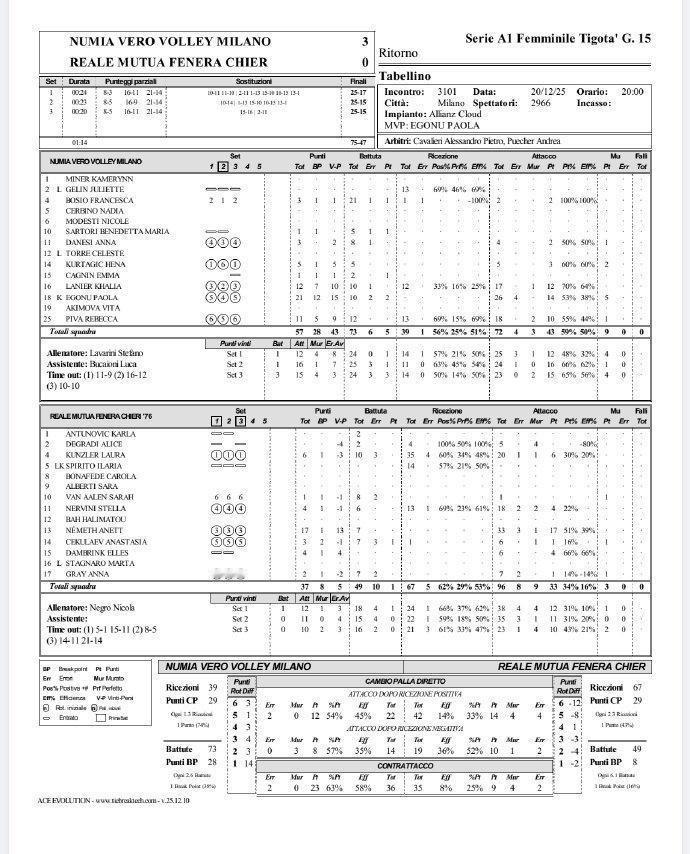 2025 - 2026赛季意甲女排第15轮,米兰在主场以3 - 0的绝对优势横扫基耶里,成功复仇。三局比分分别为25 - 17、25 - 15、25 - 15,比赛过程可谓酣畅淋漓! 艾格努状态稳健,独得21分(26扣14中 + 5拦2发),拉内尔和皮瓦的得分也均上双。米兰全队在进攻、拦网、发球等方面全面压制对手。基耶里仅内梅斯拿下17分,难以挽回败局。此役过后,米兰的排名升至第四,正朝着联赛前列稳步前行!