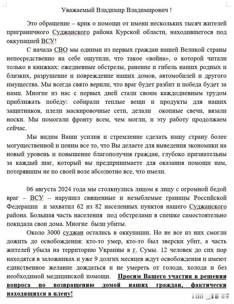 苏贾居民致信普京,控诉官员停发乌军袭击受害者补助金 库尔斯克州苏贾地区居民早