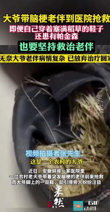 “令人心酸!”安徽蚌埠,一家医院的急诊室里,一位穿着塞满稻草的破旧鞋子的老人,紧紧守着突发脑梗的老伴。那双稻草鞋,在冬天冰冷的地板上显得格外刺眼,老人因帕金森而不受控制颤抖的双手,仍努力为老伴整理衣角。在专业医疗团队努力抢救,医生们面对复杂的病情,仍没有挽回他的老伴! 来源:【齐鲁壹点】 这家医院内,这一双塞满稻草的旧鞋格外引人注目,只要路过的人都会不自觉的看一眼。而那双鞋的主人——一位农村老大爷此刻正焦急等待着脑梗老伴的抢救结果! 尽管他自己也身患帕金森,双手止不住地颤抖,却还是坚持要为老伴治疗! 无奈的是,大爷老伴病情太过复杂,最终还是放弃治疗回家了! 路人张先生看到这一幕,忍不住落泪:“天寒地冻的,那双鞋里塞满的稻草,满是说不尽的辛酸。” 大爷脚上的稻草鞋不仅仅是冬天里的御寒工具,更像是这对老夫妻生活困境的缩影! 大爷的老伴所患的脑梗,医学上称为“缺血性脑卒中”,救治的关键在于“快”。脑梗救治每延误1分钟,就有约190万个脑细胞不可逆死亡! 虽然最终因为老伴病情太过复杂,他们选择了放弃治疗回家,但那双颤抖的手和坚定的眼神,已经写满了不离不弃的深情! 那双塞满稻草的旧鞋,走过医院冰冷的地板,也走过了相濡以沫的一生!