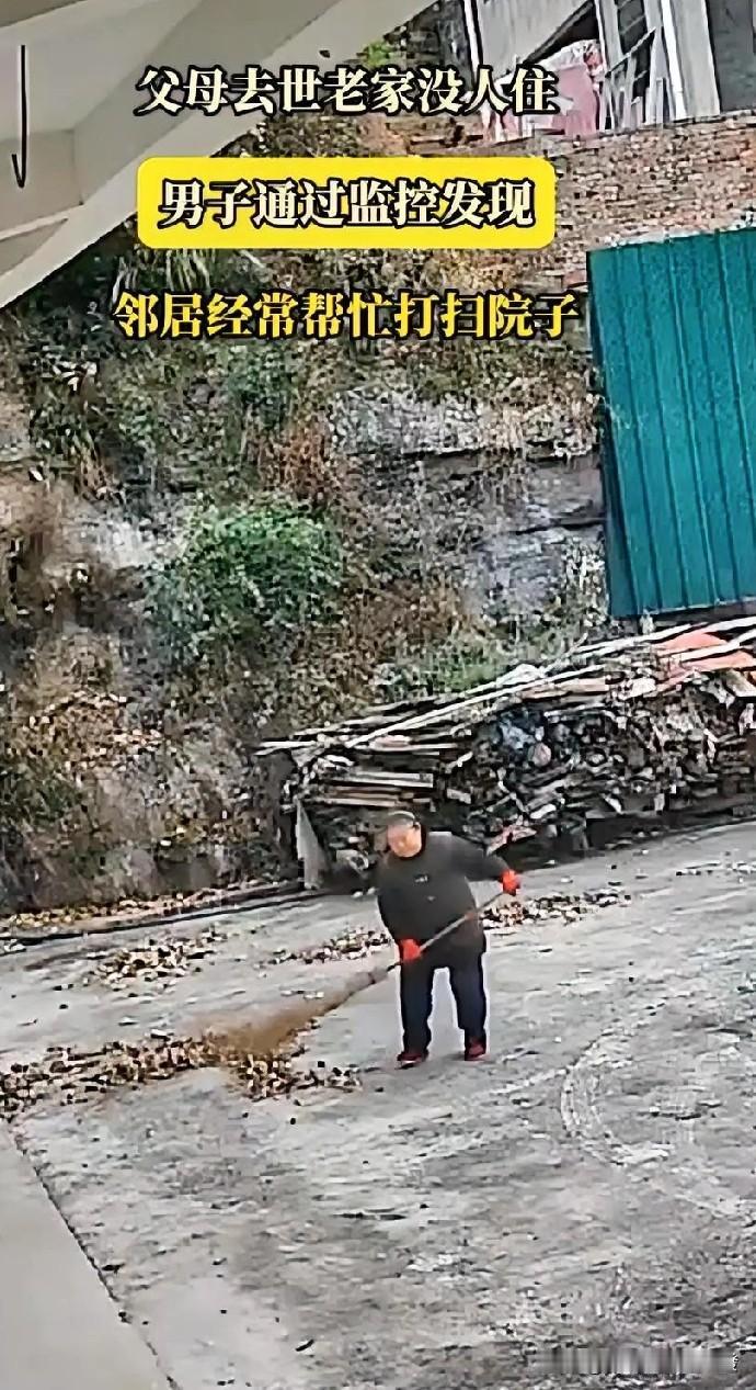 父母去世后老家没人住,男子想他们时就隔三差五通过监控看看老家,可没想到的是,他发现邻居一位老人经常过来,而且拿着大扫帚帮忙打扫院子。 那么大一个院子,一点一点地把枯黄的落叶扫到墙边,让整个院子看起来依旧像有人住的样子。 男子隔着屏幕看着整洁的院子,仿佛又看见了父母在世时的情景。 这份默默的守护,让空荡荡的院子有了温度,也有了人气。 俗话说,远亲不如近邻,邻居老人的举动不仅扫净了落叶,也扫暖了人心。 希望这样的善意与温暖,在更多地方生根发芽,来疗愈我们疲惫的心灵。 大家说是吧? 内容来源:tan探南阳