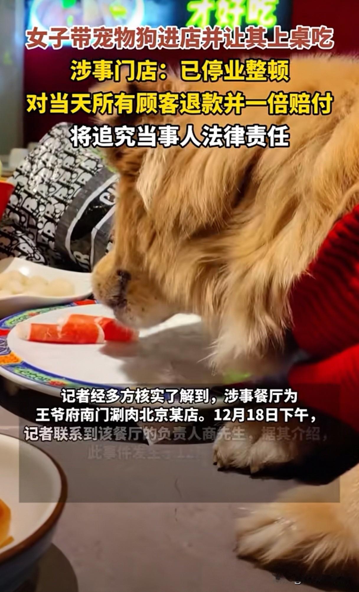 太无语啦,人畜不分!12月18日,一段宠物狗在北京某餐厅内爬上餐桌,直接食用餐盘中生肉卷的视频在网上传播,引发广泛关注。 事情最新进展:女子带宠物狗进店并让其上桌吃被发到网上后,涉事门店回应:已停业整顿,对当天所有顾客退款并一倍赔付,将追究当事人法律责任。 对于涉事门店采取的弥补做法表示赞同,不过餐饮店难道不应该明文规定,宠物不可以带进去吗? 宠爱小狗没有错,但是出入公共场所尤其是餐饮店人宠还得分开吧?这位女子这回好了,赔给顾客的钱和停业整顿的损失是彻底找着主了,也算是自找苦吃了吧? 网友:我们超市购物也是经常遇到,平常我们买吃的喝的都放购物篮里,结果有人把狗放在里面了[泪奔] 养狗爱狗没有错,也有狗主人是正常的,她们出门有拴绳的,戴嘴罩的。狗狗拉屎了她们也会用袋子捡起来收走,但是这样素质高的狗主人好像毕竟是少数吧? 文明靠自觉,出门在外,要讲公德,请把在家里的那一套收起来,您说是不是这个理? 宠物狗上餐桌 宠物狗上餐桌是否合适