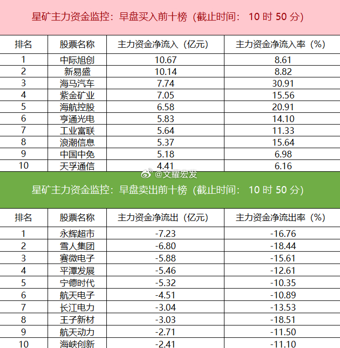 【主力资金动向:通信电子获大幅流入 中际旭创获主力加仓超10亿】星矿数据显示,今日早盘主力资金呈现结构性流向。板块方面,资金主要净流入通信、电子、有色金属等方向,其中通信板块获净流入超51亿元;而文化传媒、商贸零售、机械设备等板块则遭遇资金净流出。个股层面,中际旭创早盘表现强势,获主力资金净买入超10.67亿元,位列两市首位;新易盛、海马汽车、紫金矿业同样获资金重点流入。另一方面,永辉超市遭主力净卖出超7亿元,雪人集团、赛微电子、平潭发展等资金流出幅度居前。财经股票今日盘面分析