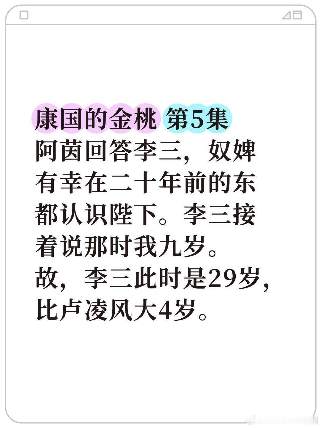 唐朝诡事录李三郎比卢凌风大4岁康国的金桃 第5集阿茵回答李三,奴婢有幸在二十年前的东都认识陛下。李三接着说那时我九岁。故,李三此时是29岁,比卢凌风大4岁。查了下果真如此,李三出生于685年,到713年夏秋之交,虚岁29岁。唐朝诡事录‖