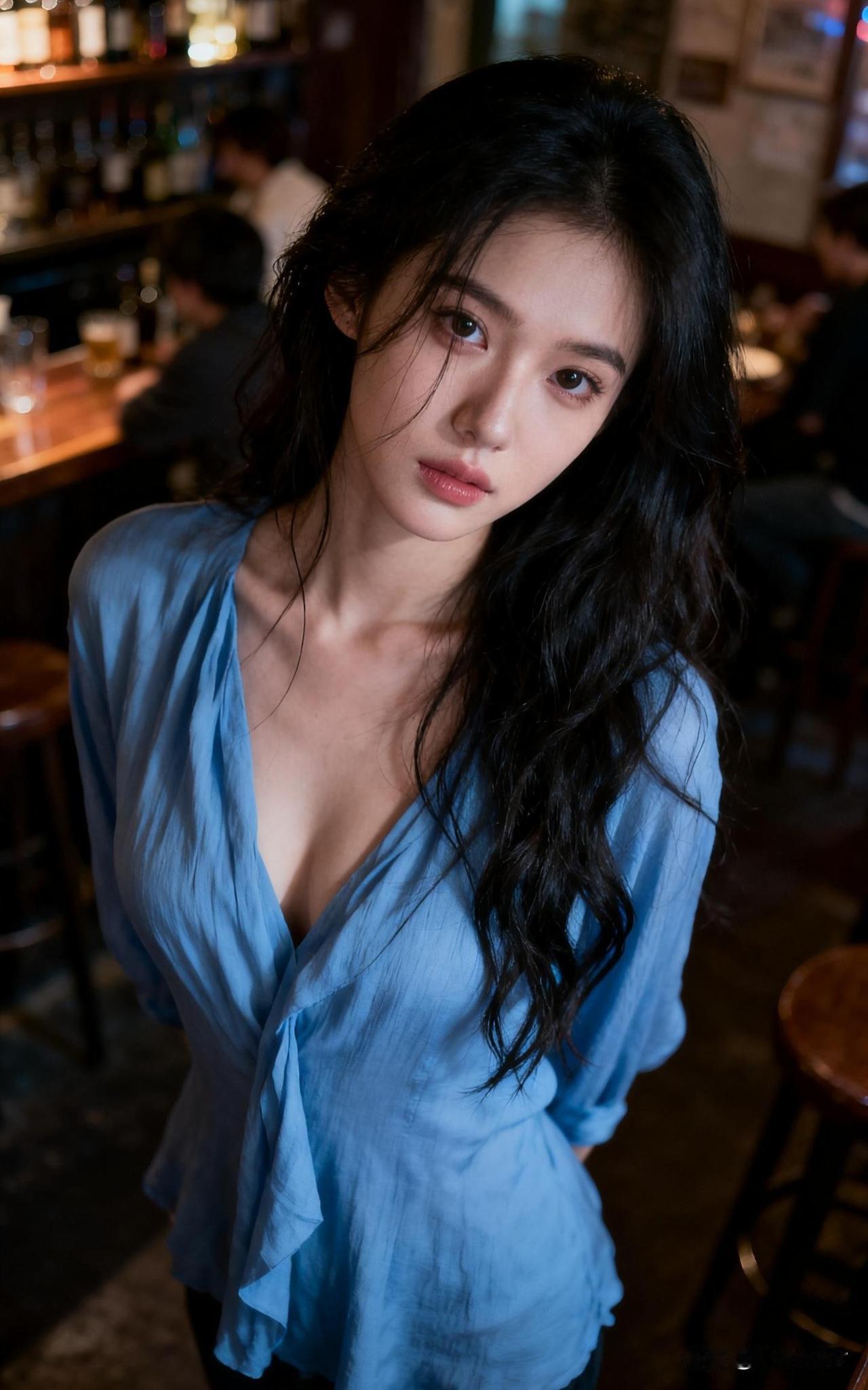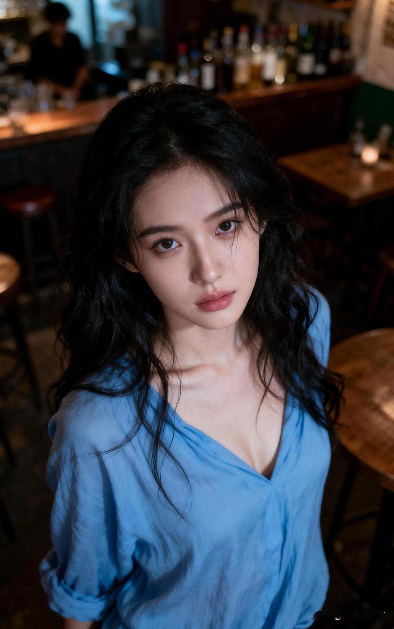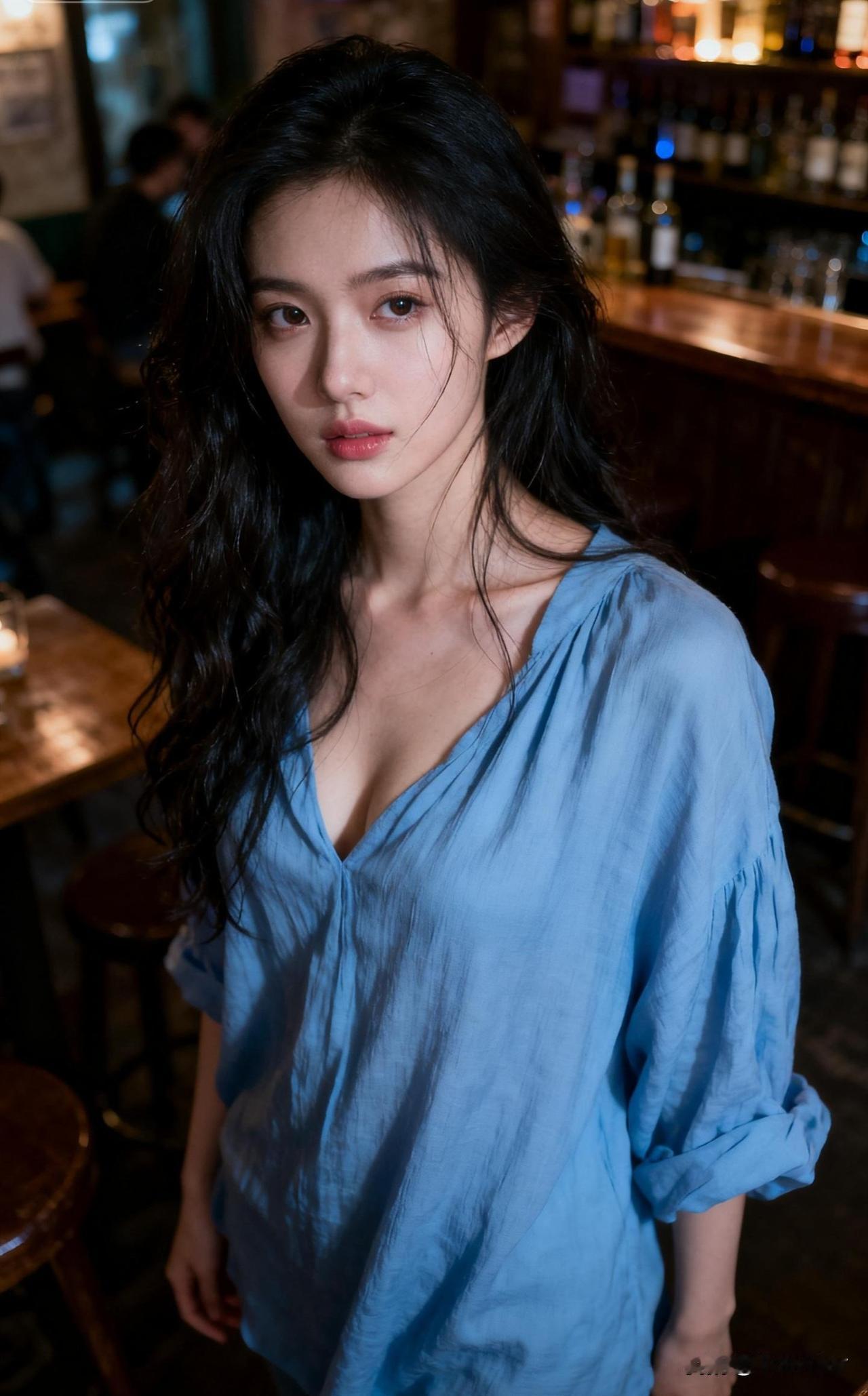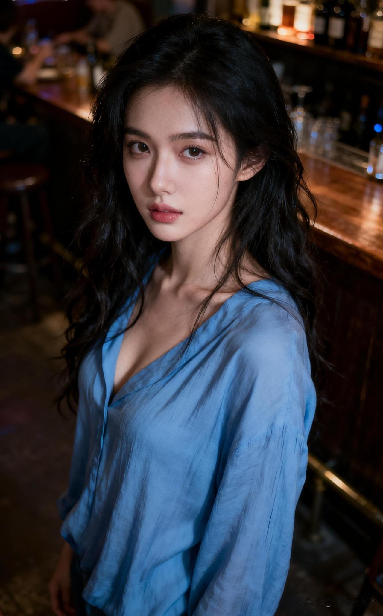 夜晚酒吧里的神秘少女,蓝色衬衫与灯光交相辉映,散发着迷人魅力。