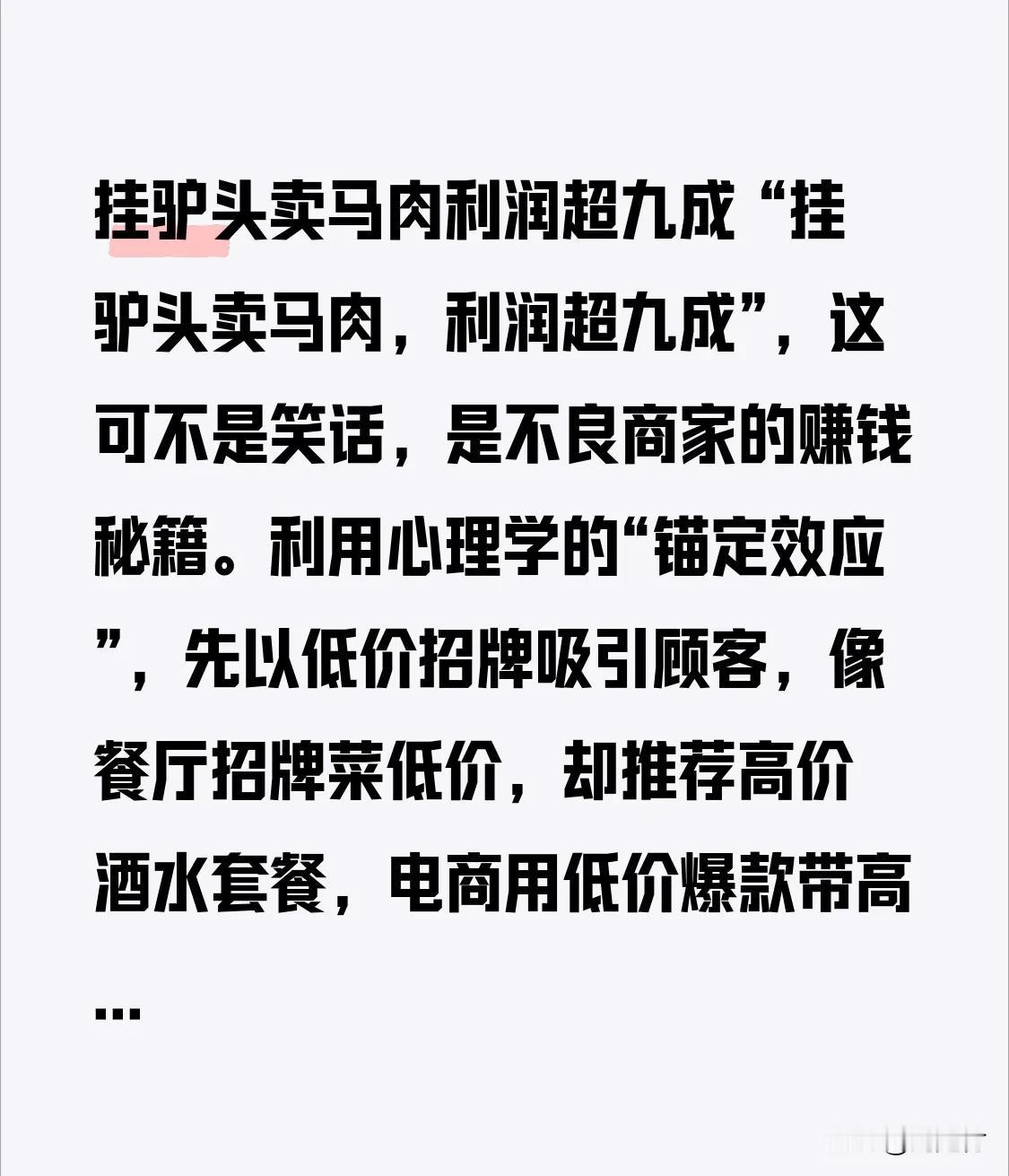 挂驴头卖马肉利润超九成 挂驴头卖马肉,利润超九成。这并非笑谈,而是不良商家的生财之法。他们利用心理学中的“锚定效应”,以低价为饵吸引顾客。如餐厅推出低价招牌菜,实则推销高价酒水套餐;电商用低价爆款带动高价配件销售。同时,还采用“损失领导者”和“分层定价”策略,以低毛利商品引流,靠高毛利周边弥补差价,并用制造稀缺的话术刺激消费。 商家还会利用信息不对称,过度包装普通产品。不过,这种经营模式风险极大,一旦曝光,品牌信任会瞬间瓦解,监管部门也会介入调查。消费者要保持警惕,避免陷入消费陷阱,守护好钱包与健康。 马驴肉 驴肉价格 熟马肉批发价格 驴肉成本计算