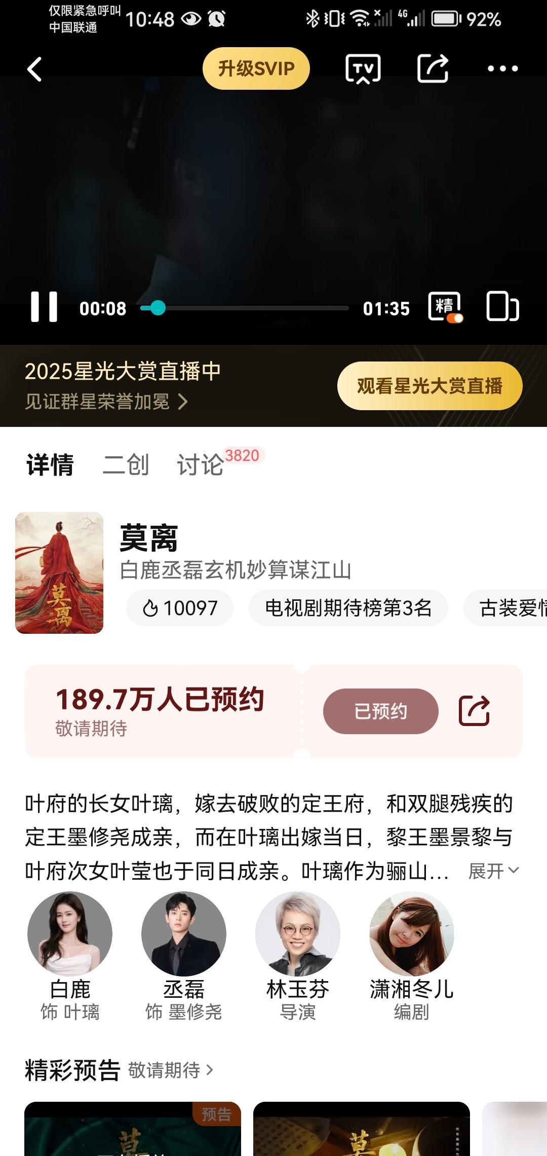 白鹿百指微指全登顶!泛人气国民度这方面,白鹿赢的很明显,腾讯待播剧莫离昨晚也破万并升至期待榜第三。更是直接闯入了腾讯热搜榜前十。星光大赏数据