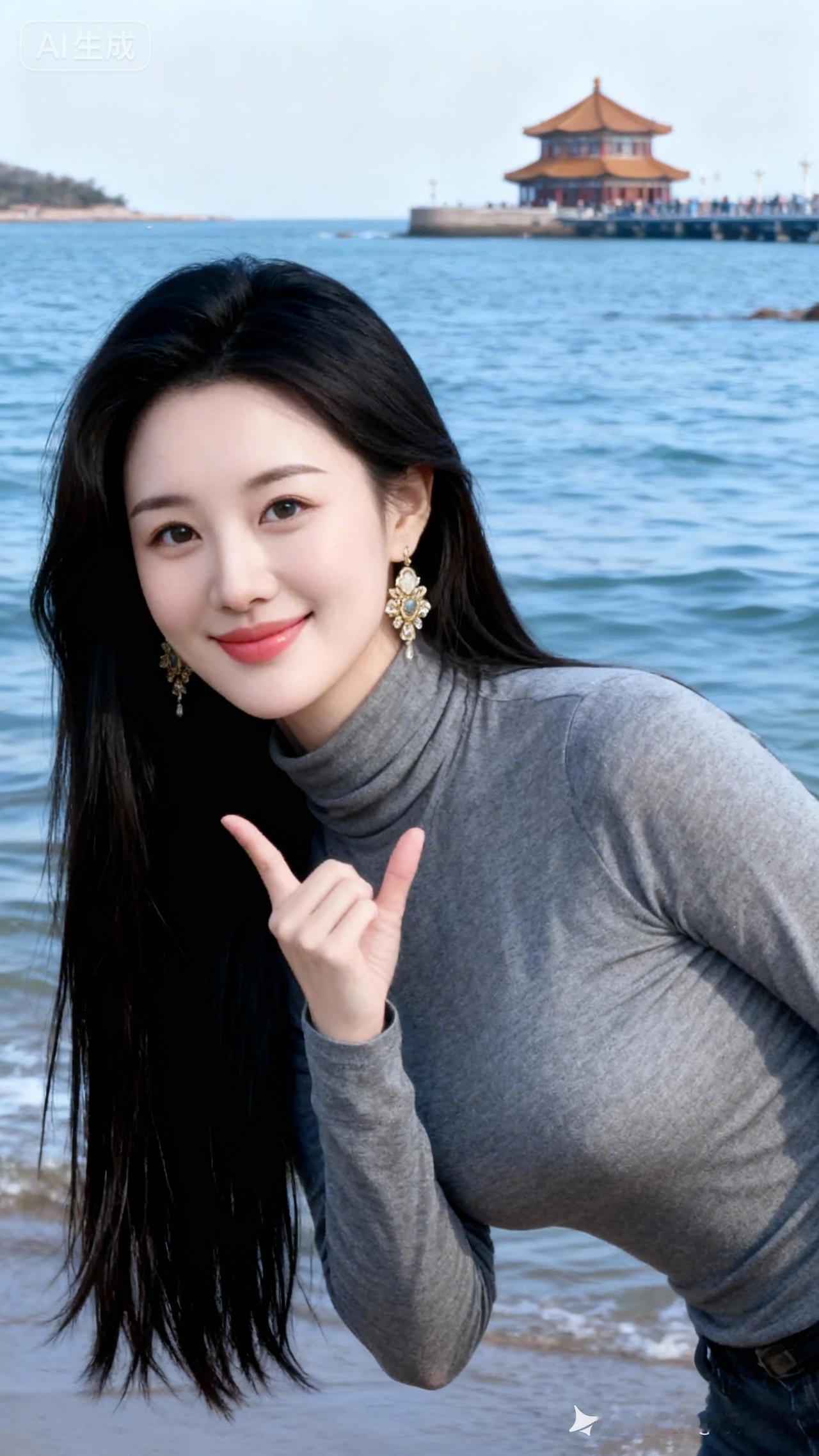 海边的少女,微笑比心,风景如画!🌊💖
