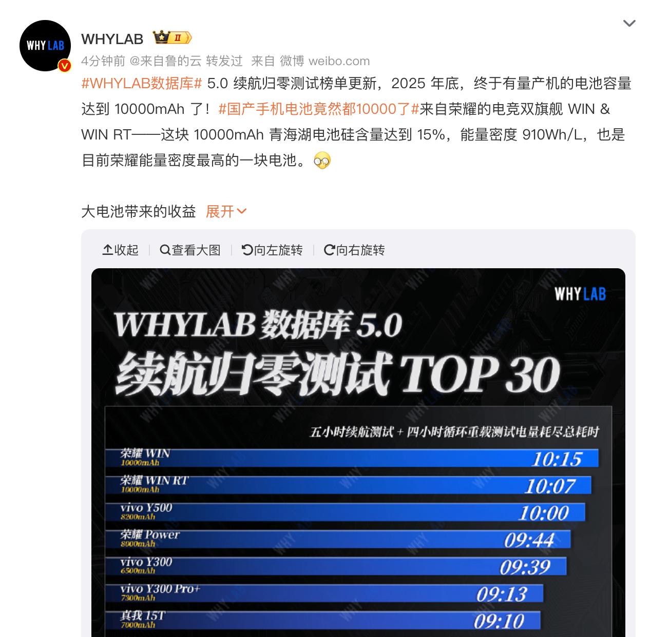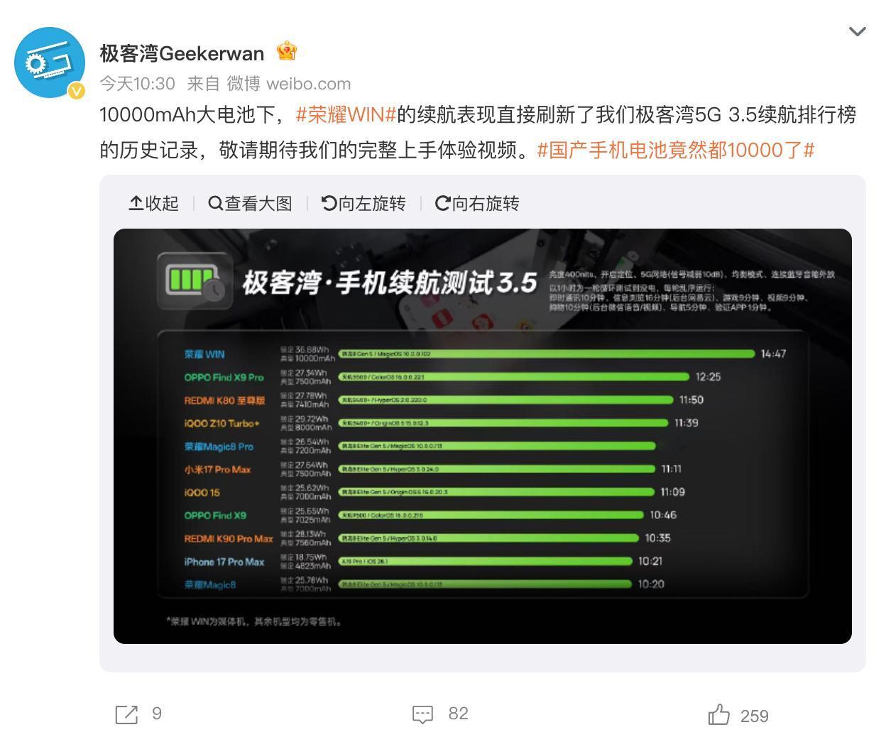阿耀来了波大招,荣耀WIN系列将搭载“万级电池” 再过几天荣耀WIN系列将正式登场,为手机续航领域带来史诗级提升,直接步入万级电池时代,这毫无疑问是同级的天花板水平。 准确来讲,此次荣耀WIN系列全系标配10000mAh巨无霸青海湖电池,这一突破性配置,直接将旗舰机续航标准大幅提升。不少人担忧大容量电池会使手机变重,但荣耀凭借自研新一代硅碳负极技术,在电池容量大幅增加的同时,将机身厚度和重量控制得极为出色,握持手感依旧出色,不得不说这十分的不容易。 在“极客湾”发布的标准化5G续航榜单上,它凭借14小时47分钟的续航时长刷新了纪录,领先一众机型;在WHYLAB进行的“续航归零”重度测试中,它也牢牢占据着第一的位置,真的是实力尽显。对于有长续航需求的朋友而言,荣耀WIN系列无疑是绝佳之选,各位说呢?荣耀WIN系列续航霸榜 荣耀WIN全系搭载10000mAh电池