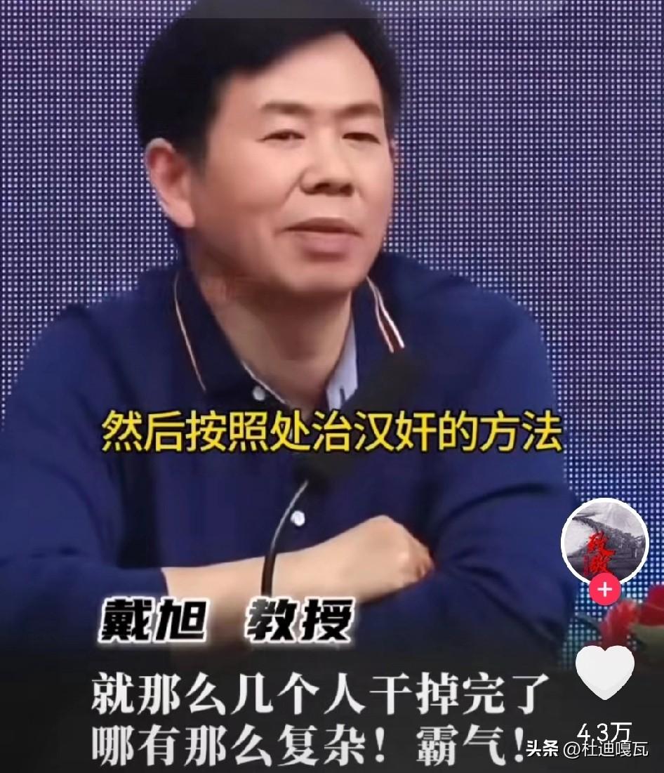 听了戴旭教授的一番话,原来真的没有那么复杂。 戴旭教授在一次演讲中提到,按照他的方法对待台独分子非常简单,可以先把他们判定为汉奸,然后再进行缺席审判,判处极刑。 下面就更好操作了,可以进行全球悬赏,利用全世界的力量对其进行围堵,其实最简单的方法就是几个定点清除就完全解决了,或者是在这些台独出访的时候,几架战机过去,三下五除二就完事。 戴旭教授的观点真是另辟蹊径,让人听了以后直呼过瘾。