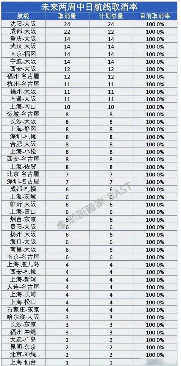 根据航班管家数据,未来两周有46条中日航线已取消全部航班。截至2025年12月22日,2026年1月中国大陆赴日航班取消量已达2195班次,航班取消率为40.4%。