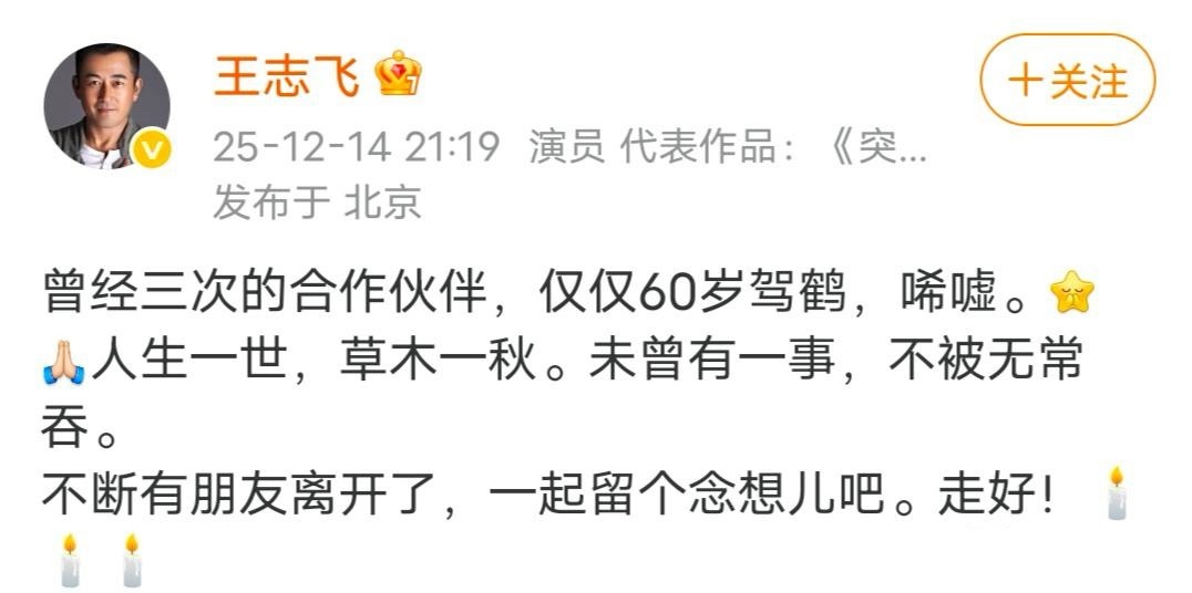 王志飞发文悼念何晴,两人曾合作三次,世事无常,何晴才60岁就因病离世,确实挺可惜的!网友评论:感觉守着电视看剧的日子并没有过去多久,怎么熟悉的演员已逐渐开始离开了双枪老太婆太喜欢这部剧了,何晴老师演的特别棒不敢相信,音容虽远,经典永存,愿天堂没有病痛,何晴老师一路走好