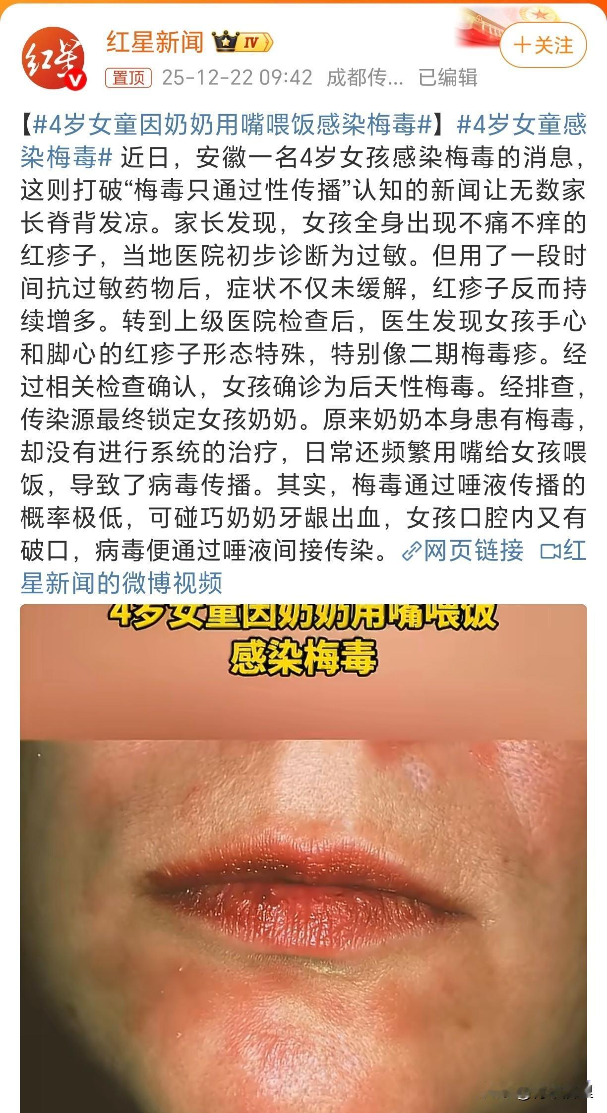 看到新闻报道,安徽一名4岁女孩全身起满红疹,当地医院一开始以为过敏,用了抗过敏药物后,但症状反而加剧了。最终经上级医院检查后,确诊感染了后天性梅毒。追踪传染源后发现,病毒竟来自她的奶奶。 原来,奶奶本身患有梅毒却没有进行系统治疗,还频繁的用嘴咀嚼后喂食孩子。在这个过程中,自己牙龈出血,孩子口腔又有破口,就导致了孩子被染上。 这不是个例, 幽门螺杆菌、疱疹病毒、手足口病,许多病原体都可能通过唾液传播。孩子还小,免疫系统尚不完善,一次不恰当的行为,可能就会给孩子带来难以承受的病痛。所以,千万不要用嘴喂孩子,这真的很重要。