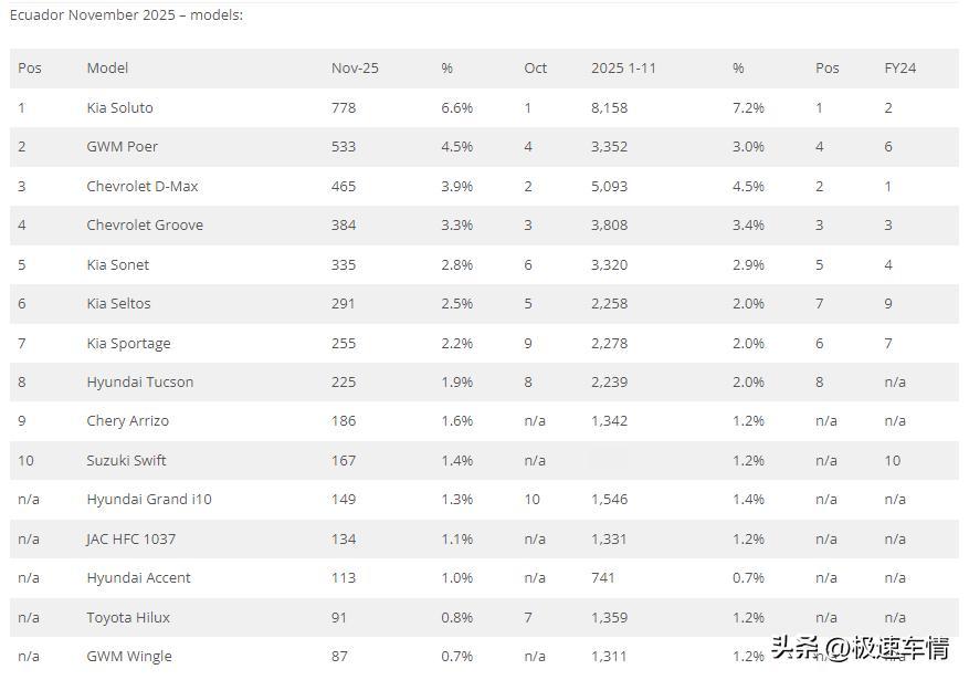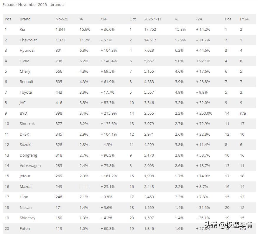 11月,厄瓜多尔车市,中国品牌销量详情! 大家好,这里是极速车情。今天为大家带来厄瓜多尔汽车市场10月份的销量数据报告。 11月,厄瓜多尔车市,中国品牌凭借高性价比和丰富产品线加速抢占市场。长城和奇瑞的多款车型已成功打破传统品牌垄断 。并且,厄瓜多尔纯电车市场正在快速升温,年度电动车销量同比增长202%,成为市场增长引擎。比亚迪作为当地最受欢迎的电动车品牌,未来可期 。 2025年11月,厄瓜多尔新车销量同比暴增46.3%,至11,810辆。 2025年1-11月,厄瓜多尔累计销量同比增长13%,至112,550辆。 中国品牌表现:长城汽车(+140.4%)环比跃升2位,两者均实现翻倍级增长,长城炮高居车型榜第二;江淮(+83.3%)、奇瑞(+69.5%)、比亚迪(+215.9%)均跑赢市场,其中比亚迪以超200%增速成为前十中同比增长最快的品牌;捷途(+161.2%)升至第 15 位,表现亮眼。 长城:738辆,第四名,市占率6.2%。 奇瑞:566辆,第五名,市占率4.8%。 江淮:416辆,第八名,市占率3.5%。 比亚迪:398辆,第九名,市占率3.4%。 中国重汽:377辆,第十名,市占率3.2%。 东风小康:345辆,市占率2.7%。 捷途:269辆,市占率2.3%。 鑫源斯威:150辆,市占率1.3%。 福田:119辆,市占率1%。