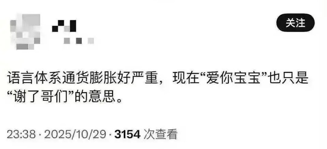 连语言也在通货膨胀以前听到喊宝宝感觉好宠溺,现在听到人家喊我宝宝,我会立马感觉对方在给我套近乎,想卖我东西。