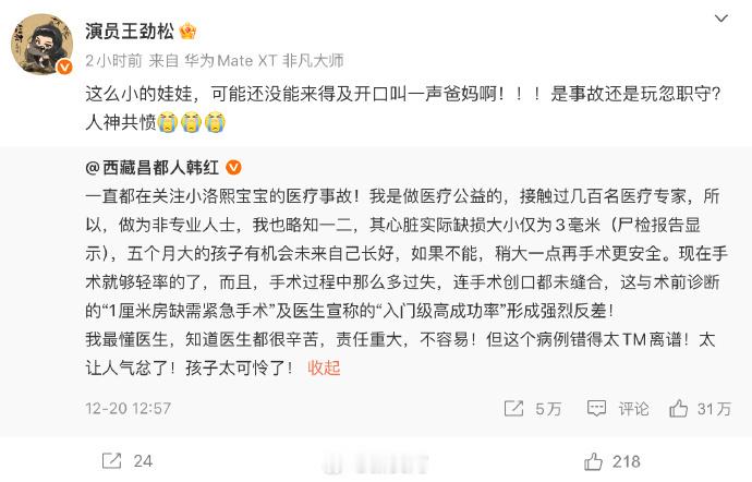 【王劲松说被小洛熙事件气疯了】王劲松说心疼小洛熙2025年11月14日,5月龄早产儿小洛熙在宁波大学附属妇女儿童医院接受心脏房间隔缺损手术时离世,该事件引发社会广泛关注。12月22日转发 此前发声博文,并附文表达痛心与愤慨:“这么小的娃娃,可能还没能来得及开口叫一声爸妈啊!是事故还是玩忽职守?人神共愤!有时觉得自己很无力无能,不知道能做点啥?相信很多人也会一样,为孩子心疼,气疯了”此前报道:12月20日晚,宁波大学附属妇女儿童医院发布情况说明,尸检报告显示:“房间隔缺损大小为1.0cm×0.9cm”,而不是患方所说的0.3cm。在尸检时,患儿的心脏处于停止状态,较生前充满血及跳动时有大幅度缩小。1cm左右的房间隔缺损对于5个月患儿的生长发育存在较大的影响。相关说明发布数分钟后随即删除。演员王劲松为小洛熙发声