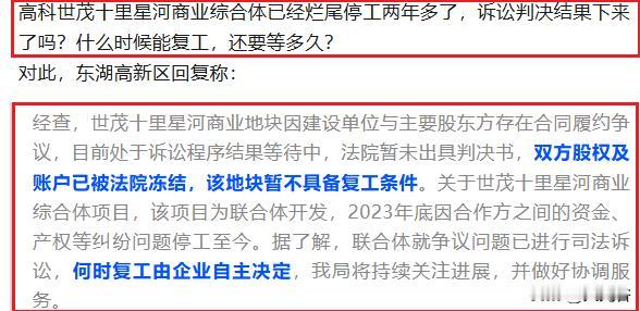 光谷东高科世茂十里星河商业综合体暂不具备复工条件 据武汉城市留言板近日消息,光谷东高科世茂十里星河商业综合体项目,因股东间存在资金及产权相关纠纷,现已处于停工状态,原2025年5月的交房计划未能按期执行。该商业体规划总建筑面积超10万方,自2023年年底以来,建设单位与项目股东因合同履行问题产生分歧,进而引发资金分配、产权界定等方面的争议,相关纠纷已进入司法诉讼程序。现阶段,项目涉事股权及账户已被依法冻结,暂不具备复工条件,后续复工及交付工作将依据法院生效判决推进。 据悉,高科世茂十里星河商业TOD商业综合体,项目建筑体量约10万方,是区域内率先启动的大型商业综合体,旨在重构光谷商业消费体验,为区域创造全新的商业活力。项目位于11号线未来三路站旁,西侧紧邻千亿产业大道——左岭大道,10万方TOD商业综合体建成后对于整个左岭区域都有重要意义。