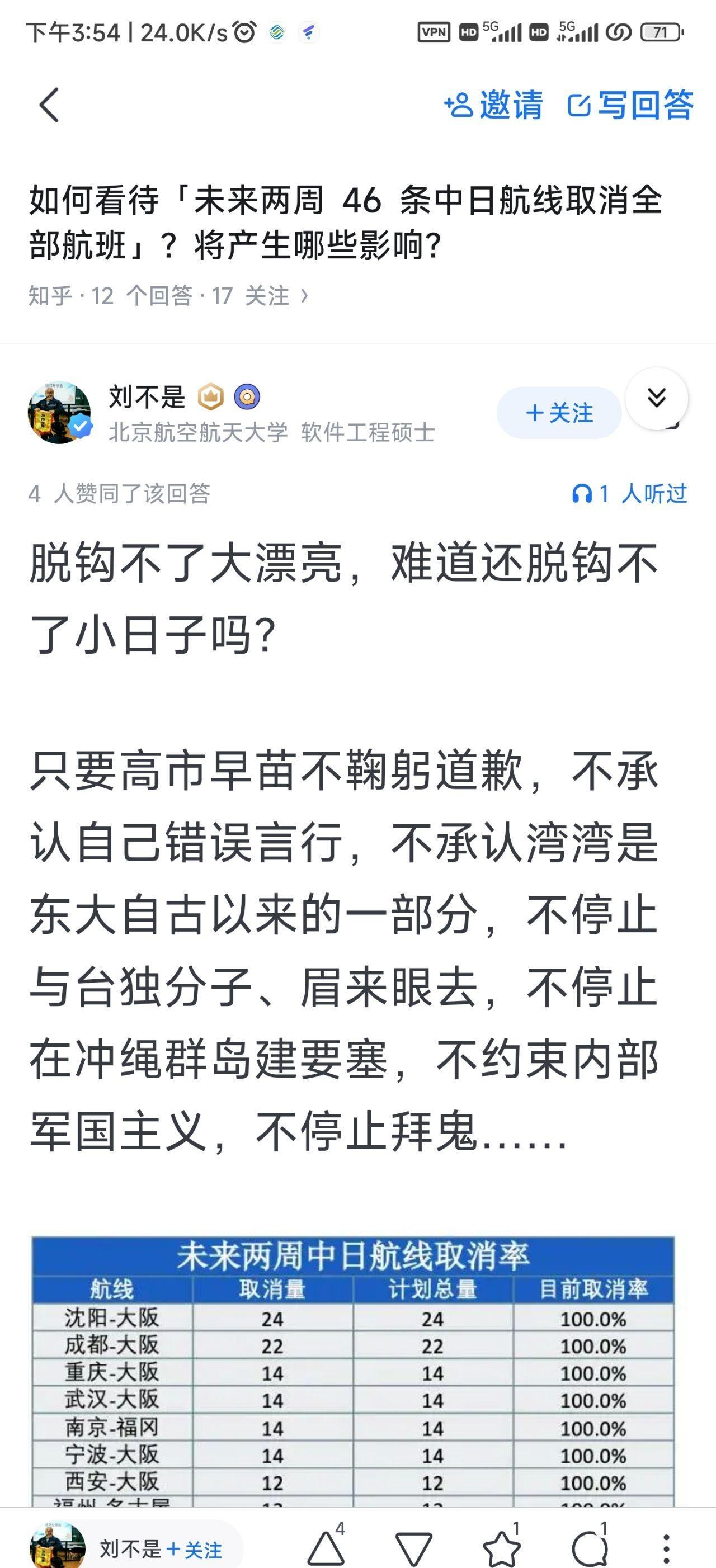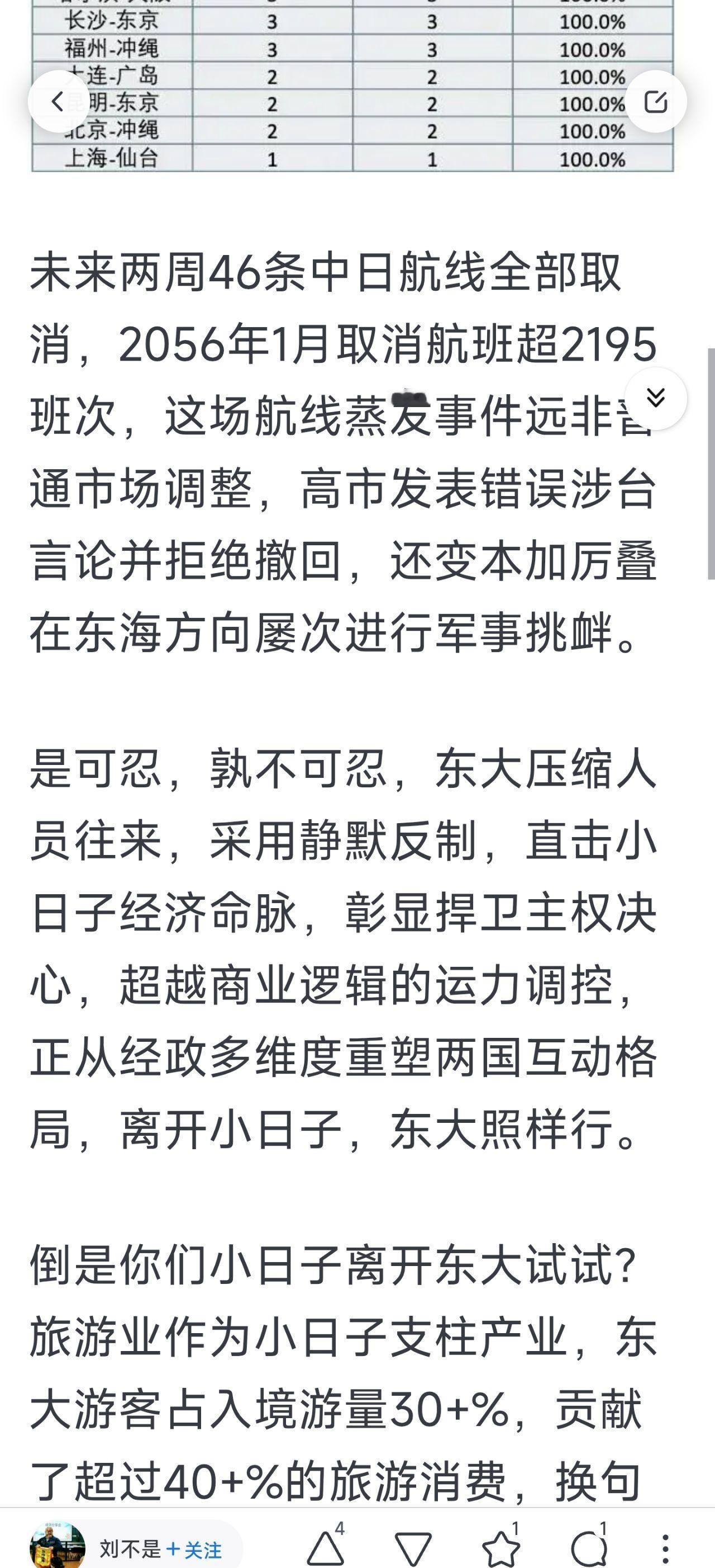 如何看待「未来两周 46 条中日航线取消全部航班」?将产生哪些影响? 航班管家DAST预测,未来两周有46条中日航线取消全部航班,涉及的航线包括沈阳-大阪、南京-福冈、武汉-大阪、福州-名古屋、上海-冈山、成都-札幌等。 ------------------------------------ 会导致ai智械危机,2056年都来了。