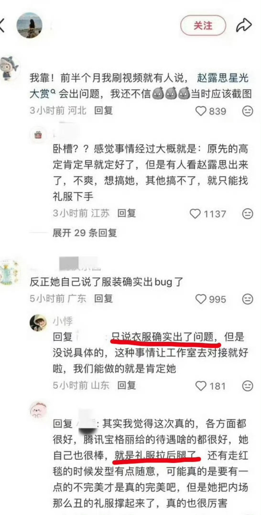 闵塔鲨辟谣网传赵露思礼服出问题事件。