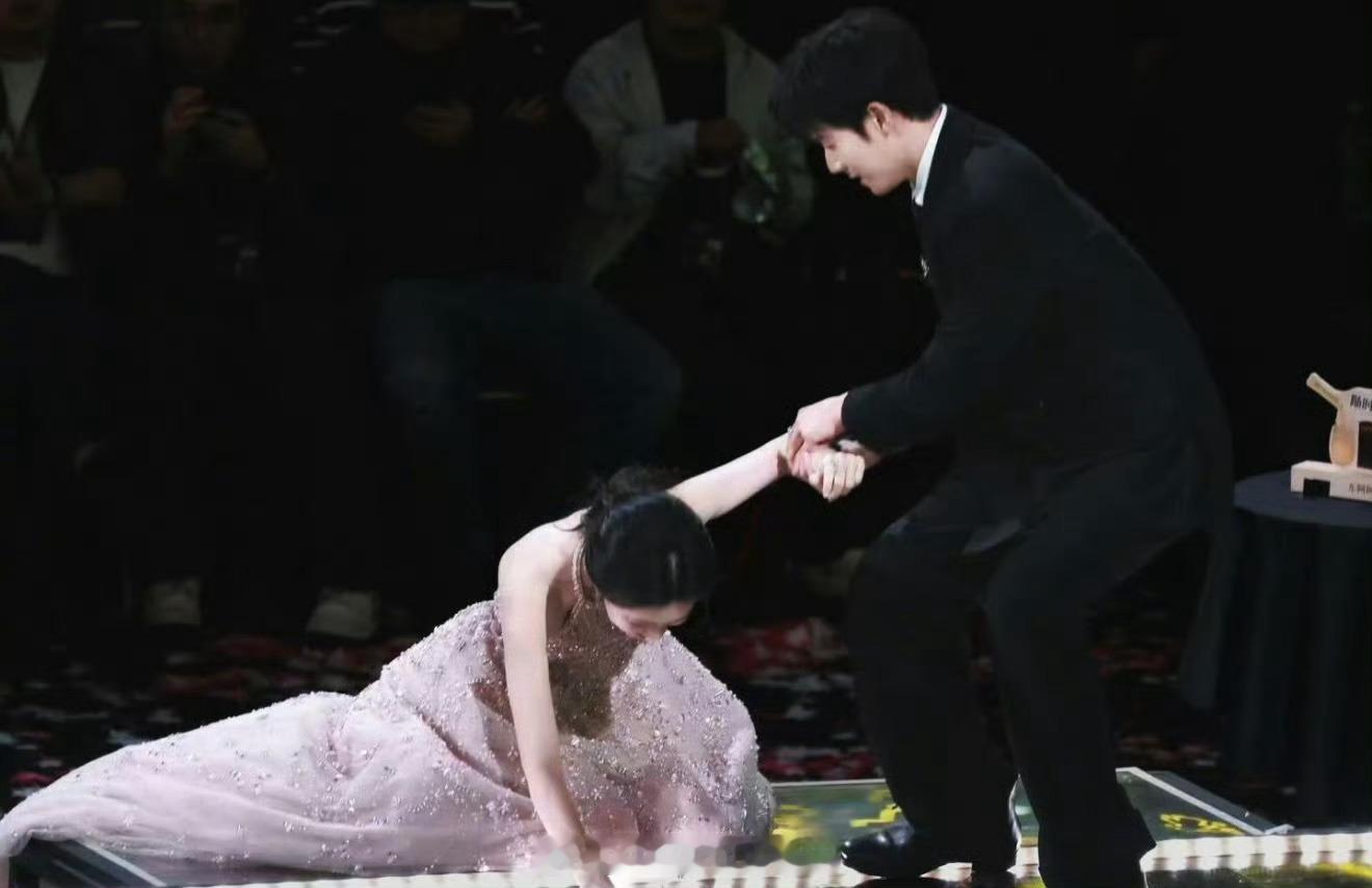 周也头纱被踩周也亮相星光大赏红毯时,因超长珍珠头纱意外被踩