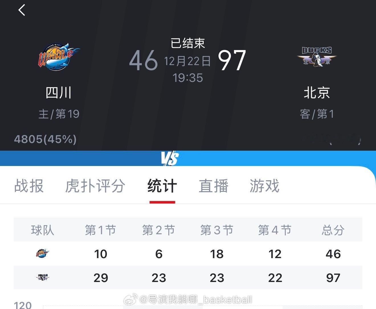 见证历史,四川男篮在今天对阵北京北汽的比赛中输给对手51分,单场只拿到46分排在