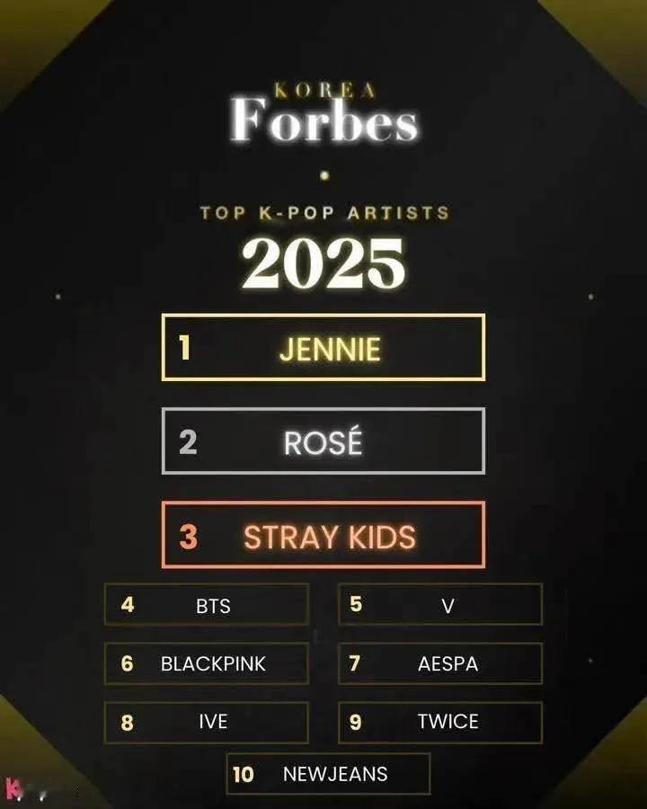 2025福布斯前10名K-POP艺人Jennie 朴彩英 Stray Kids BTS 金泰亨 BLACKPINK aespa IVE TWICE NewJeans
