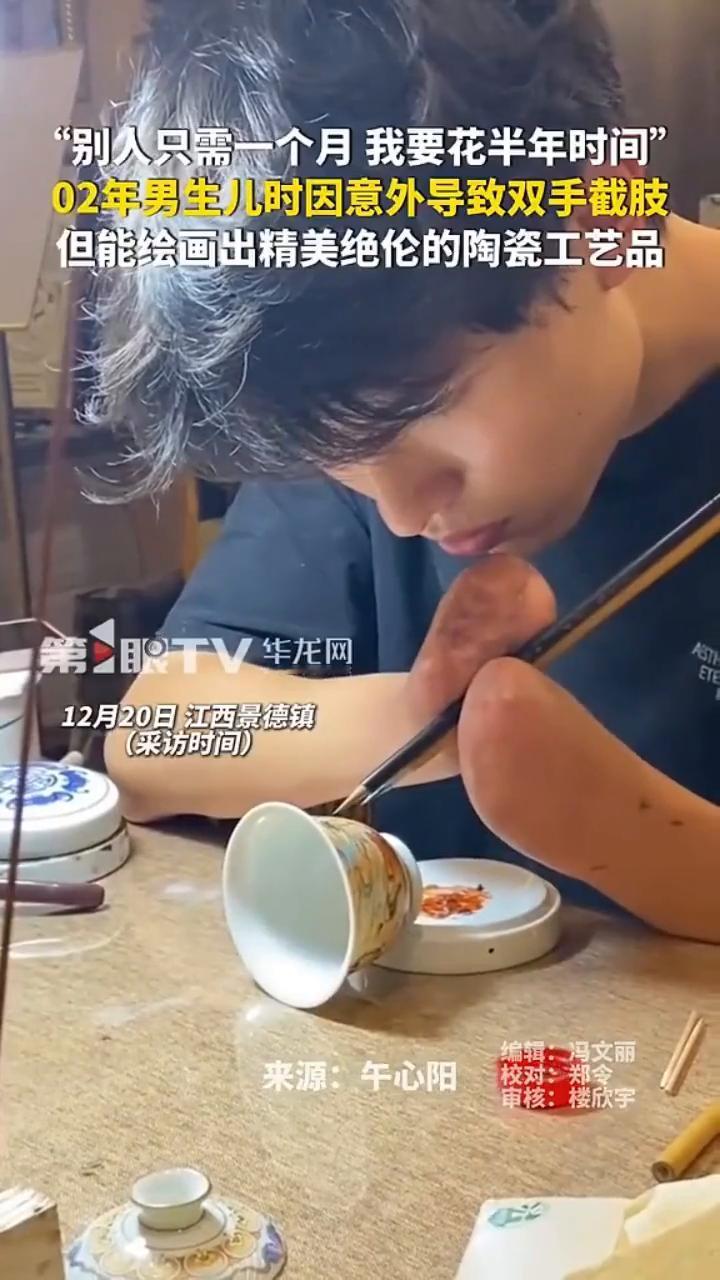 "别人只需一个月我要花半年时间",02年男生儿时因意外导致双手截肢,但能绘画出精美绝伦的陶瓷工艺品。 第1眼TV-华龙网原创采访。 许志阳:小时候就是在农村建自建房,他们(大人)都是要去帮忙的,没有人照看我,摔进石灰了,后面就截肢了。 (长大后)到了景德镇读大学,在学校里报了陶瓷设计绘画(专业),学了差不多有5年了。刚刚开始画的时候就比较难,好的线条差不多是要花了半年才练出几根好的线条。像同学差不多一个多月就能画出比较好的(线条)。我就是死磕到底,立志想开一个画展。(最后)我在学校就开了一个个人画展,奖学金也全部拿到了。 震撼!此人前途亮到极致了!未来可期!少年加油!