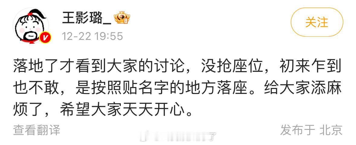 王影璐解释自己没有抢座位,是按照贴名的地方落座的。起先有网友说王影璐抢了丞磊的座位。王影璐 没抢座位