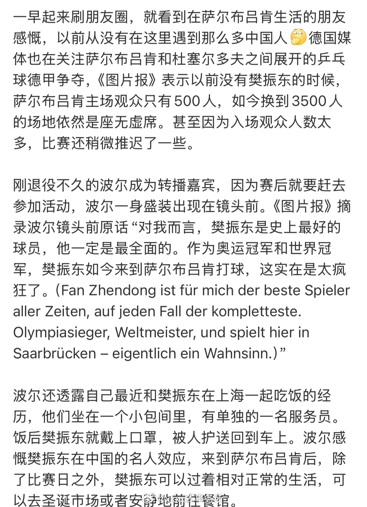 樊振东德甲联赛加盟萨尔布吕肯后,主场观众数呈量级暴涨,从场均观众约500人直接换到3500人的场地,堪称“一人带火一座馆”“一个人带火一座城”