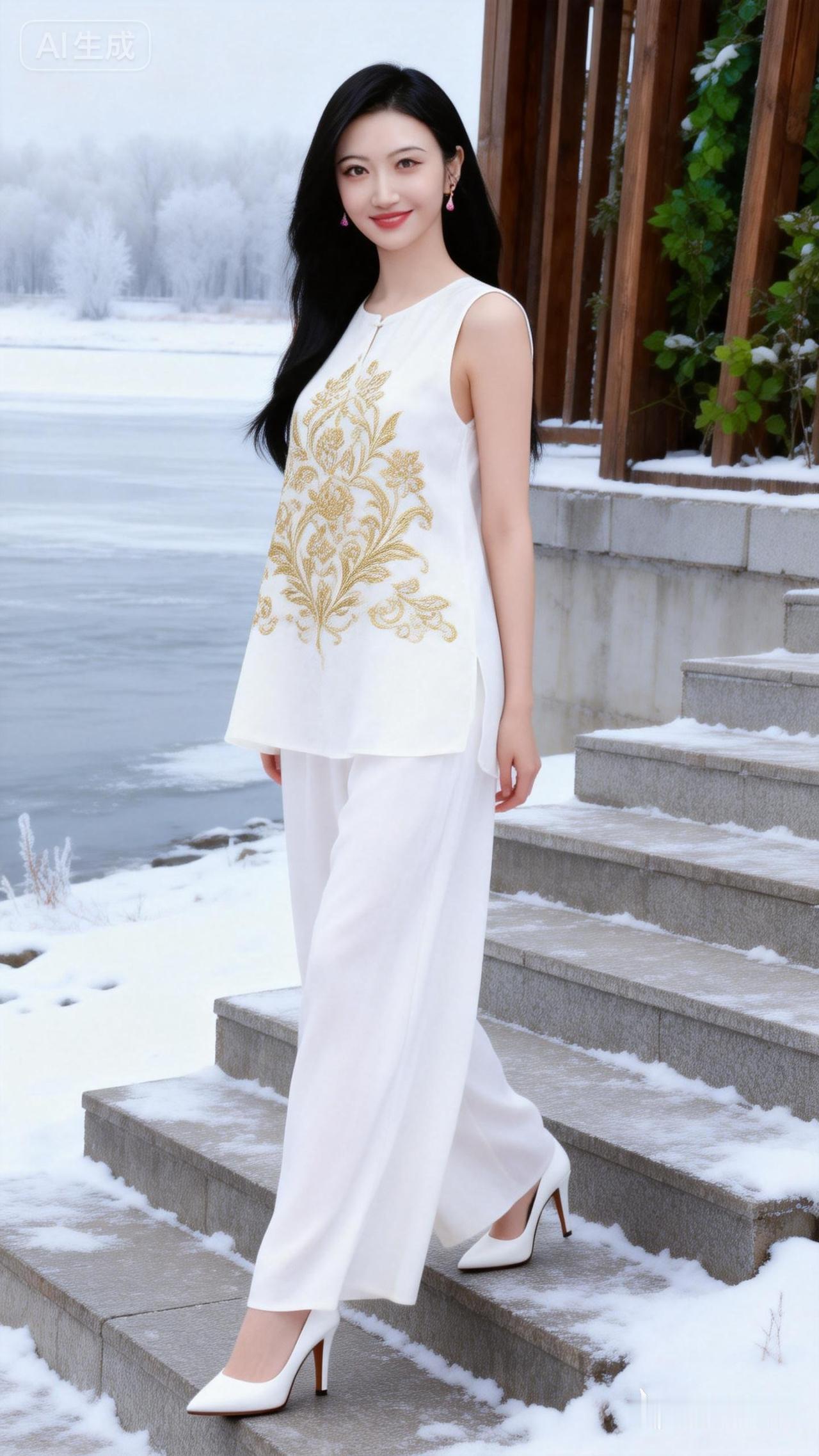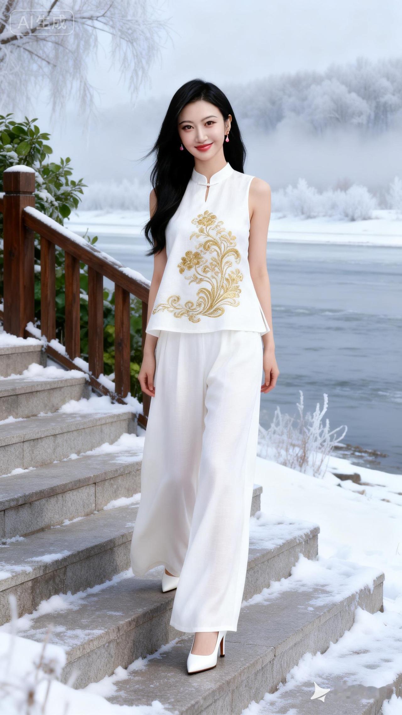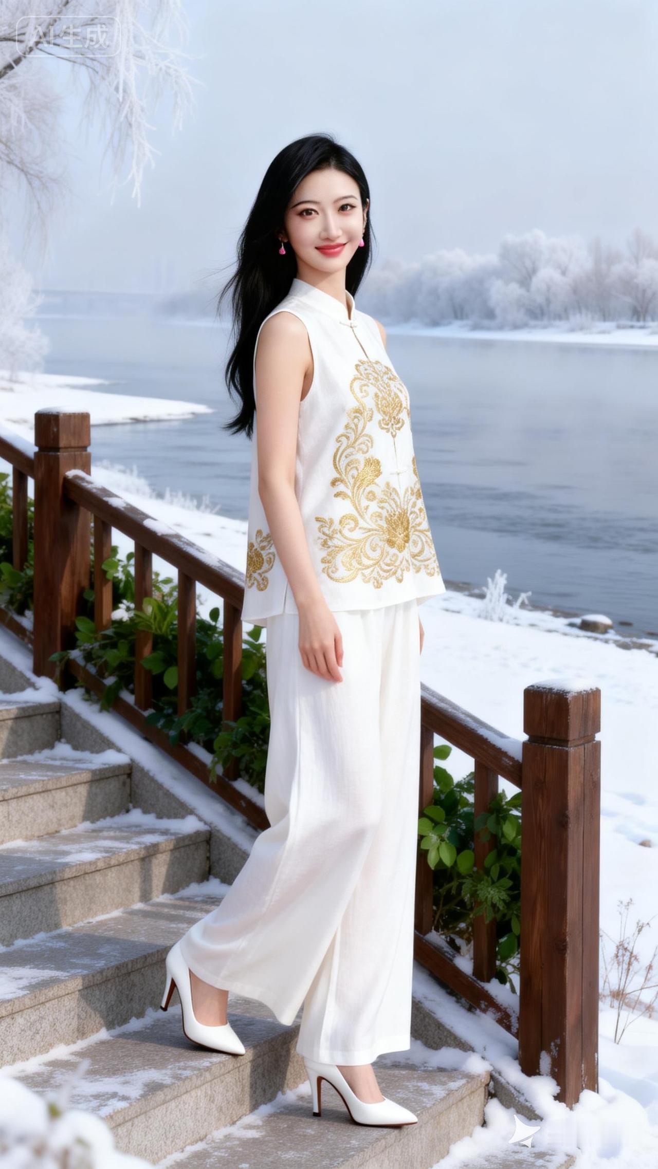 冬日雪景中的优雅穿搭,白色长裙与金色刺绣的完美结合,尽显温柔与高贵。