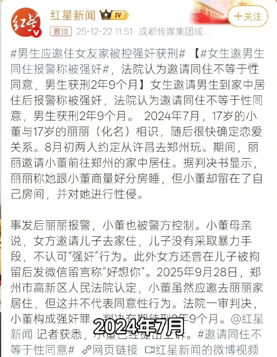 河南郑州,17岁女生主动邀请一男生到她家住,男生欣然赴约。女生跟男生商量好分房睡,但男生却留在她房间,两人发生关系,女生随即报警,称男生强奸。男生被拘,但男生的母亲却不认可该指控,还称女生想自己的儿子,法院支持女生诉求,男生不服提出上诉。 17岁的女生丽丽(化名)与男生小董(化名)相识已久,后来两人以朋友相称。 2024年8月初,两人为促进感情,相约去郑州游玩。 后丽丽主动邀请小董到自己家中做客,小董欣然赴约。 考虑到男女有别,也为了划清相处边界,丽丽提前与小董商量好,当晚两人分房睡,小董暂住客房。 小董当时满口答应,丽丽也并未多想。 可到了深夜,小董却并未遵守分房睡的约定,反而留在了丽丽的房间内。 不顾丽丽的抗拒,强行与她发生了性关系。 事发后,丽丽又气又怕,当即选择报警,指控小董强奸。 警方介入调查后,依法对小董采取了刑事拘留强制措施。 消息传到小董母亲耳中,她却坚决不认可强奸的指控。 在她看来,丽丽主动邀请儿子到家中,就意味着不排斥亲密接触,事后报警是反悔。 她还声称,丽丽平日里就喜欢自己的儿子,自己儿子在拘留中,丽丽还发短信说好想他,两人发生关系是你情我愿,儿子不该被刑拘。 面对小董母亲的辩解,以及小董“双方自愿”的供述。 法院梳理细节,审理过程中,明确了几个关键事实: 一是丽丽事前明确提出“分房睡”,这一行为本身就是拒绝发生性关系的意思表示。 二是丽丽事发后第一时间报警,其陈述前后一致,情绪状态符合受害者特征。 三是邀约同住属于社交行为,绝不能等同于对性行为的默许。 《刑法》第236条明确规定,以暴力、胁迫或者其他手段强奸妇女的,处三年以上十年以下有期徒刑。 即便没有明显的暴力行为,违背妇女意志强行发生性关系,同样构成强奸罪。 最终,法院结合案件证据,认定小董违背丽丽意志,强行与其发生性关系的行为已构成强奸罪,依法支持了丽丽的诉求。 法院判决小董有期徒刑2年9个月。 小董不服判决结果,已向上一级法院提出上诉,目前案件正在二审审理中。 在两性交往中,尊重是底线,边界感是准则。 丽丽年仅17岁,属于未成年人,其身心发育尚未完全成熟,自我保护能力相对较弱。 法律对未成年人的性自主权,始终秉持着更为严格的保护原则,绝不允许以任何借口侵犯未成年人的合法权益。 女性的身体自主权不容侵犯,违背意志的性关系,终将受到法律的严惩。 即便熟人之间,也必须恪守法律与道德的双重底线,否则,一时的冲动与漠视,换来的终将是法律的制裁和人生的污点。 对此,你怎么看?