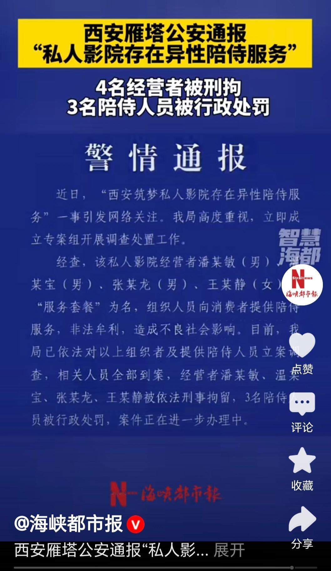 私人影院暗藏“陪侍服务”,西安警方出手一锅端!老板和陪侍处理结果竟大不同? 昨