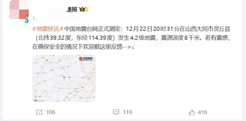 山西大同深夜“抖一抖”!4.2级地震震源仅8公里,睡梦中的人们注意了! 家人们,今晚这一觉睡踏实了吗?12月22日晚上8点31分。这个点,多少人正窝在沙发上看电视,或者刚哄完娃准备睡呢? 中国地震台网正式测定,山西大同市灵丘县发生了4.2级地震。震源深度只有8公里! 这8公里是啥概念? 就好比在地底下8公里的地方放了个大鞭炮。虽然震级不算大,但因为离地表太近,震感会非常强烈。震中位于北纬39.32度,东经114.39度,离灵丘县城也就19公里左右。 肯定有朋友在问:“我在太原(或周边)咋没感觉?” 这地震波传得远不远,跟地质构造有关。虽然官方数据是4.2级,属于“有感地震”,通常不会造成破坏,但那种“床在晃、灯在摇”的感觉,绝对能把人吓得一激灵。 虽然这次只是个小震动,但咱们必须得长个心眼。400多年前,也就是1626年,灵丘这地界可是发生过7级大地震的! 历史的教训告诉我们,地质活动这事儿,宁可千日防,不可一时疏。 最后问一句: 当时你在哪儿?感觉到晃动了吗?或者你是灵丘的乡党吗?评论区里吱一声,报个平安!