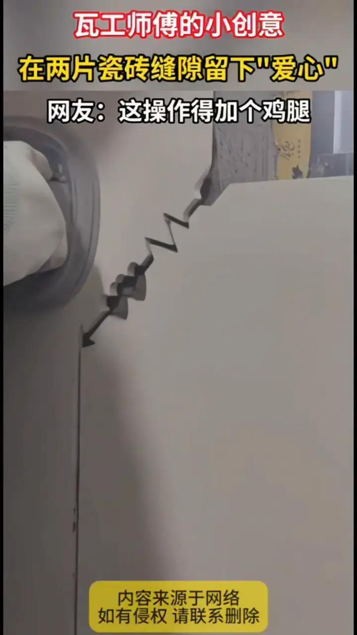 贴砖时,瓦工在水泥缝里给你藏了一颗心。 刀尖一挑,水泥勾勒,一颗心。 郑州这位张师傅,干了15年瓦工。他说就是顺手一事,给业主留点念想。业主王女士看到后,转头给他加了500工钱。中国建筑装饰协会把这叫“用心服务”。 微博上吵了2000万条。原来这么多人盼着:来家里的师傅,手下能有这点热气。 水泥是冷的,活法是暖的。他封进瓷砖的不是水泥,是良心。