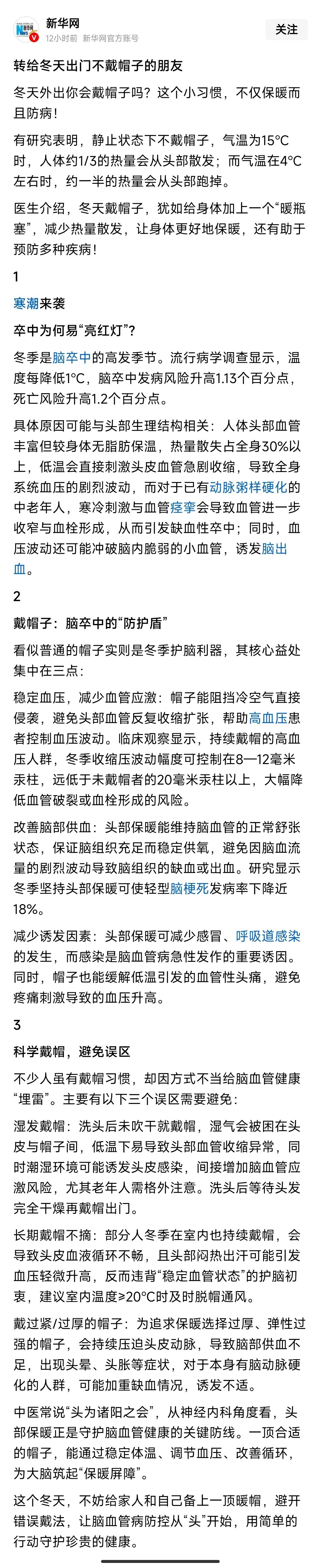 详详细细看了新华网发布的这篇文章之后,我决定本周之内一定要去买一顶帽子! 我是一名高血压患者,每年冬天血压控制都不理想!虽然我知道这是由于天气寒冷的原因,但是我从来没有想过头部保暖,对于稳定血压如此重要! 我的头发已经掉了1/3,虽然还没有完全成为一个秃顶,但是保暖作用已经大不如以前,的确是需要用帽子帮助保护头部热量不至于过多散失的程度了。 心动不如行动,这个周末我就决定到超市去买一顶棒球帽,让这个冬天自己的脑袋暖乎乎的,血压不要再上窜下跳!
