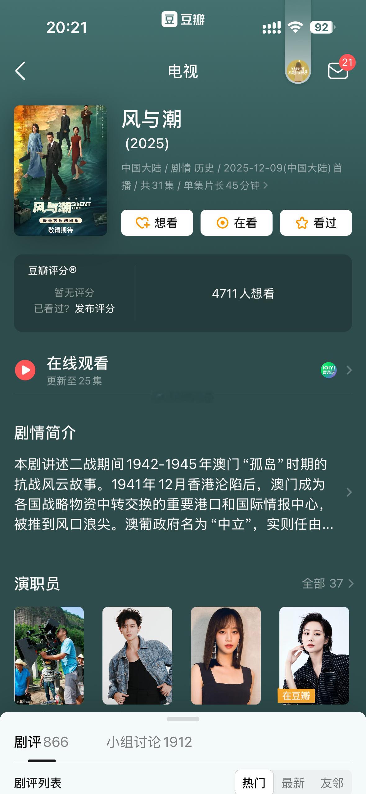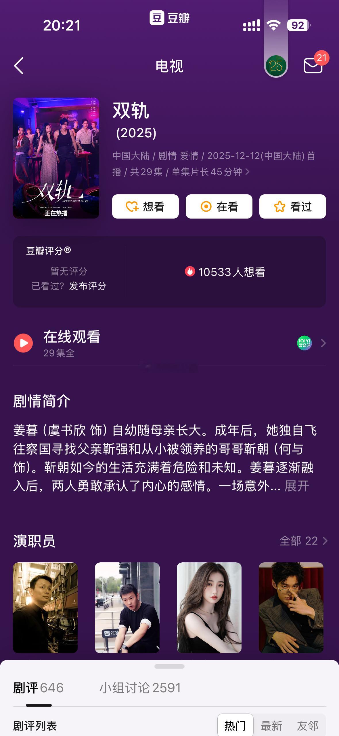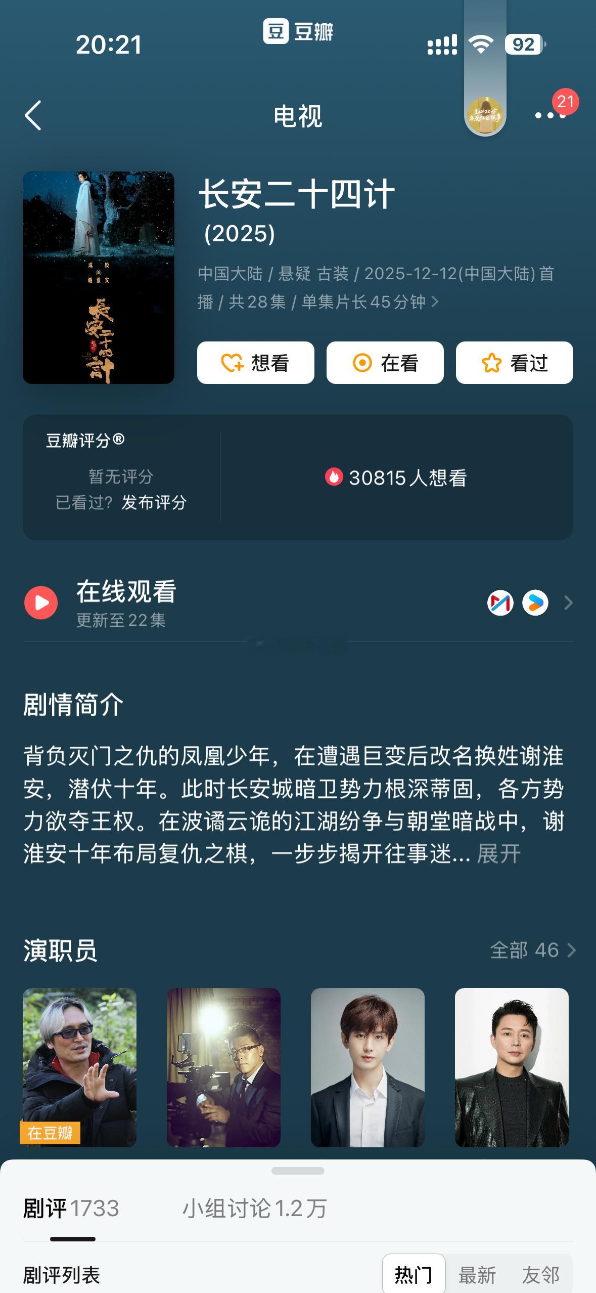 虞书欣何与的《双轨》已经播完了,也没有开分成毅的《长安二十四计》和任嘉伦的《风与潮》也马上播完,都没有开分