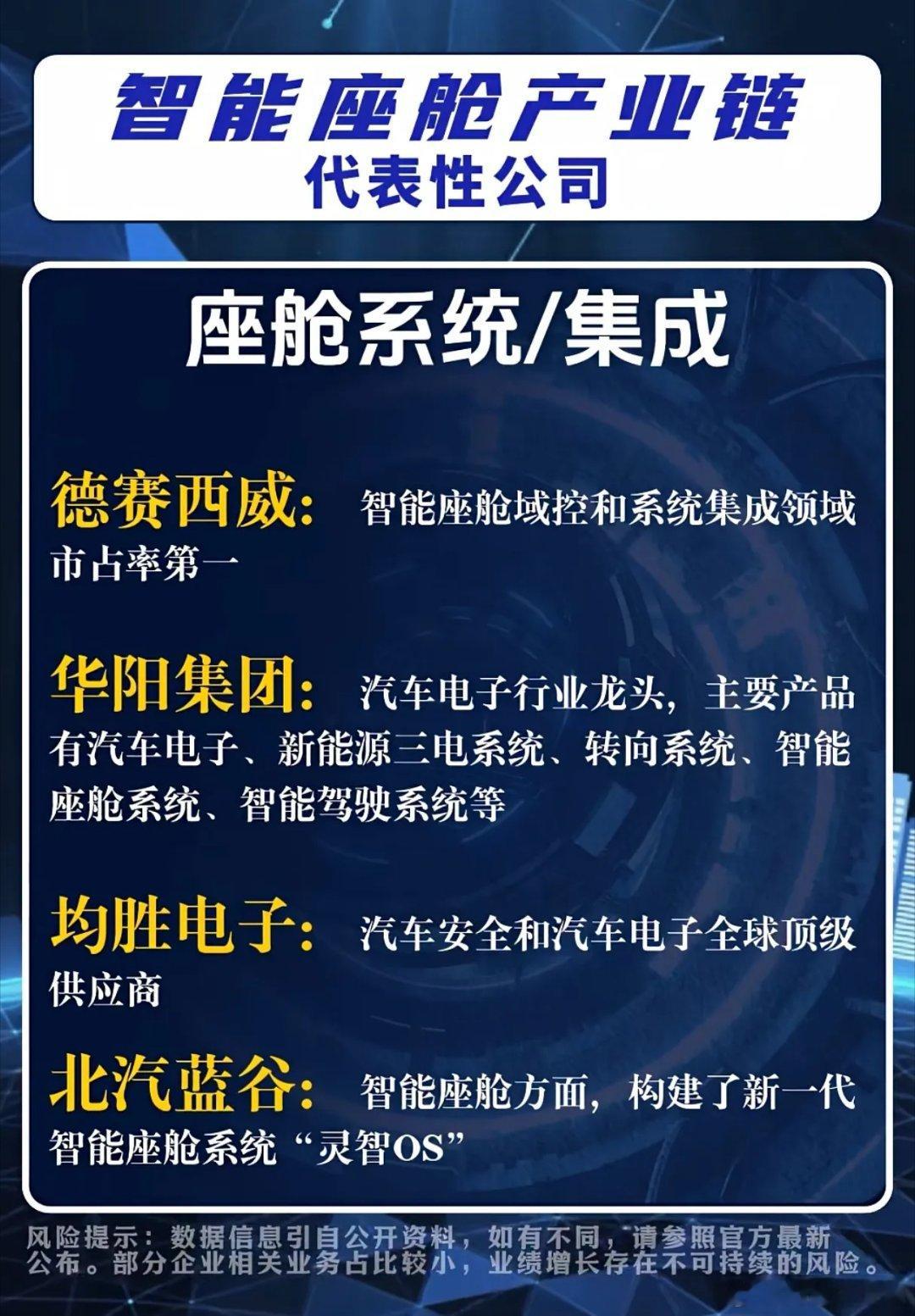 智能座舱成汽车升级新风口?产业链龙头全曝光,谁掌握核心话语权?智能座舱已成为新能源汽车差异化竞争的核心赛道,从硬件芯片到系统集成的产业链企业各展所长,瑞芯微、德赛西威等龙头企业凭借技术优势,在这场产业升级中抢占了先机。在硬件与软件底层环节,瑞芯微是国内少有的智能座舱芯片上市企业,四维图新自研舱行泊一体SoC芯片,为座舱智能化提供核心算力支撑;京东方凭借全球领先的半导体显示技术,成为智能座舱屏幕的核心供应商。景旺电子作为全球第一大汽车PCB供应商,筑牢了座舱硬件的电路基础;水晶光电布局HUD、电子后视镜等座舱外设,丰富了智能交互场景;中科创达则实现了智能座舱OS到整车操作系统的全技术覆盖,成为软件端的重要玩家。座舱系统集成领域更是竞争激烈,德赛西威在智能座舱域控和系统集成领域市占率第一,是车企的核心合作伙伴;华阳集团以汽车电子为根基,打造了智能座舱系统的完整产品矩阵;均胜电子凭借汽车电子全球顶级供应商的身份,在座舱智能化与安全性上形成优势;北汽蓝谷则推出“灵智OS”智能座舱系统,实现了整车端的场景落地。智能座舱的发展与汽车智能化升级深度绑定,随着新能源汽车渗透率的提升,座舱的交互体验、智能化水平成为消费者购车的重要考量。这些产业链企业分别卡位核心芯片、显示技术、系统集成等关键环节,构建了智能座舱的产业生态。不过部分企业相关业务占比较小,业绩增长的可持续性仍需理性看待,但毋庸置疑的是,智能座舱赛道的技术创新,将持续推动汽车产业向智能化、网联化转型。