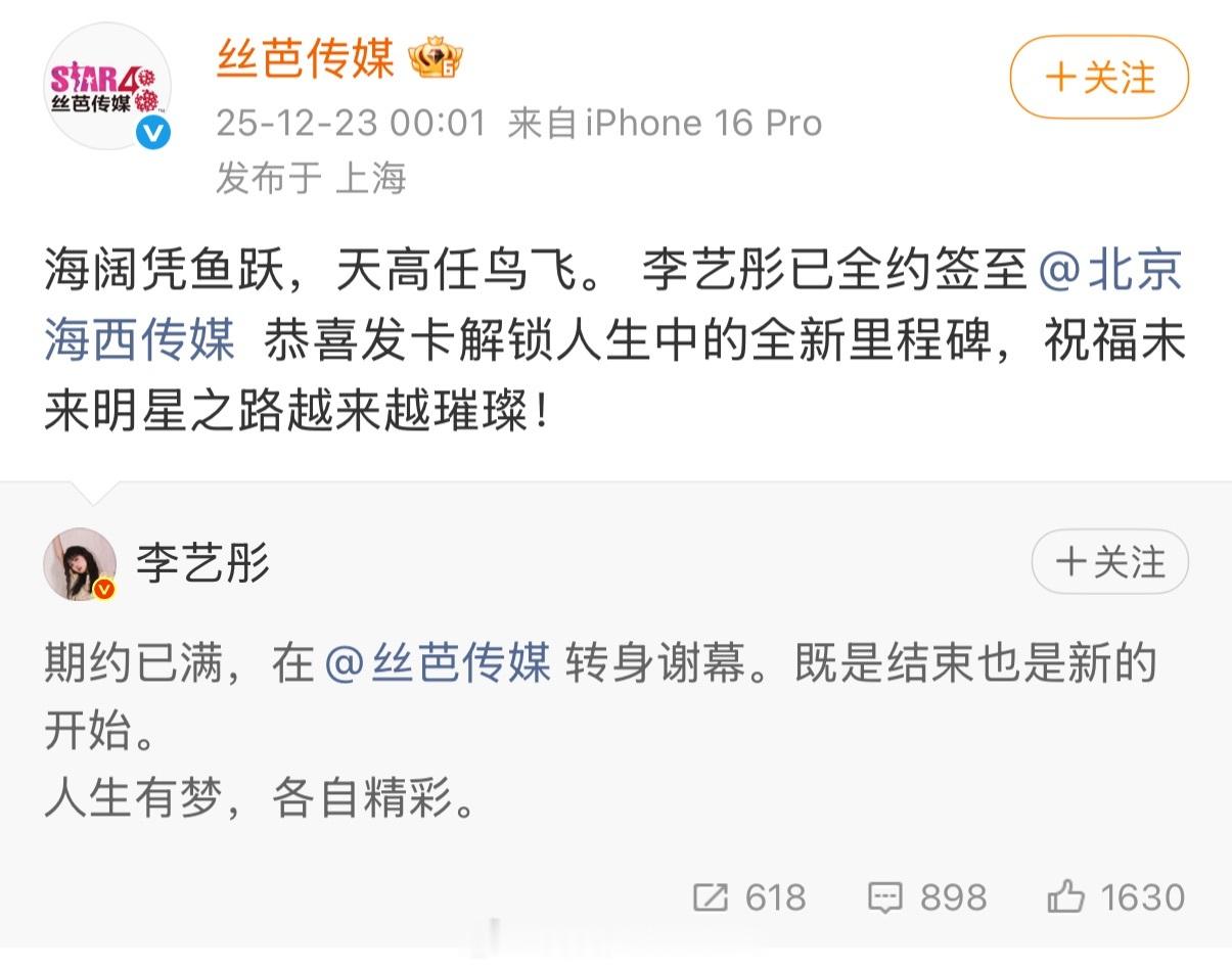 李艺彤发微博,宣布和丝芭解约了。丝芭也转发微博,祝她未来越来越好。鞠婧祎羡慕吧?