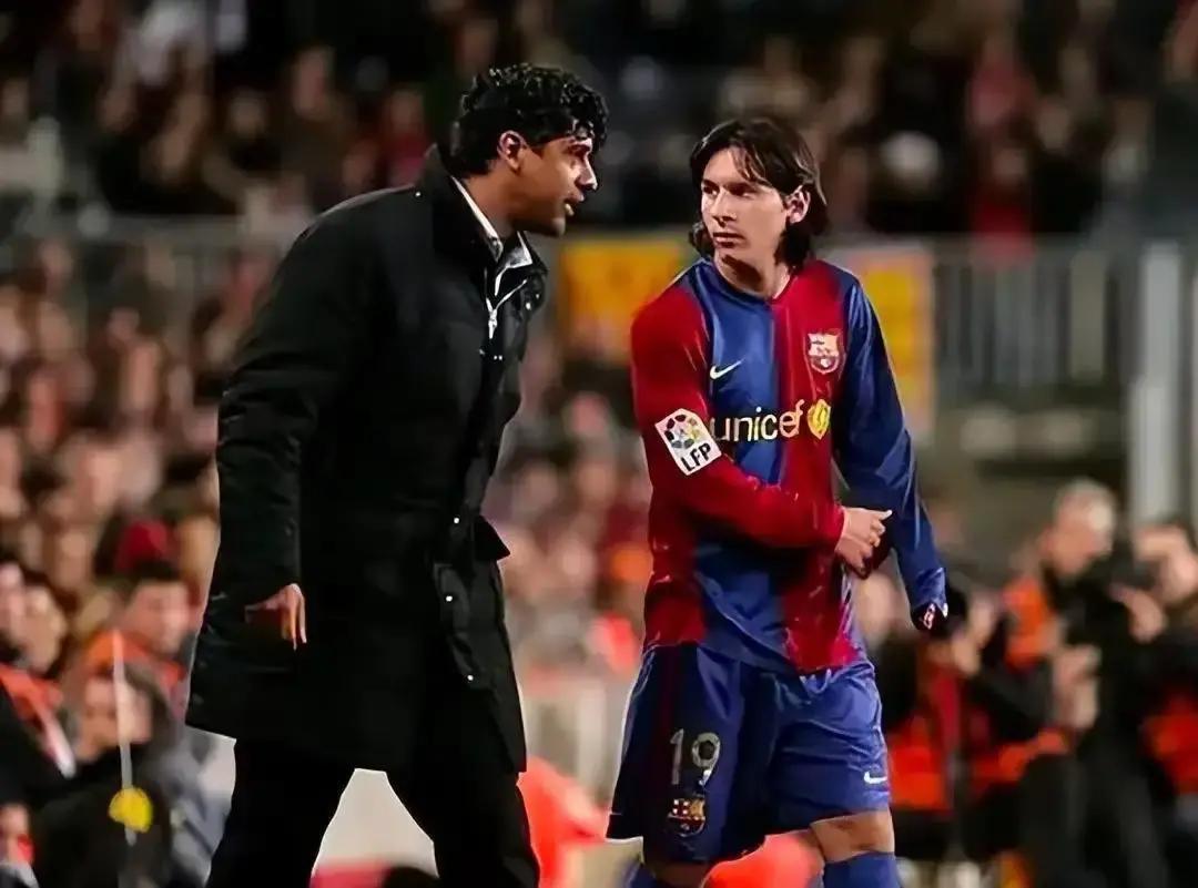 2004年训练场,里杰卡尔德多盯了梅西十秒,足球史就拐弯了。 更衣室炸锅:17岁豆芽菜? 他一句话怼回去:“把球给他,剩下的他包圆。” 战术板连夜重画,所有箭头指向那个瘦小身影。 05年5月1日,梅西西甲首球,助攻的小罗赛前被老里耳语:“去,扶孩子一把。” 这不是战术,是教父递刀。 梅西后来叫他“足球父亲”,听着就暖。 天才得生两次:一次靠DNA,一次靠有人敢赌。