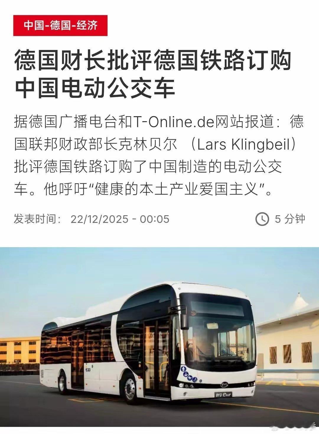 外媒:德国财长批评德国铁路订购中国电动公交车。 德国铁路集团向中国制造商比亚迪订购了200辆电动公交车,德国联邦财政部长克林贝尔 (Lars Klingbeil)酸文假醋地说:这让我感到恼火……我希望看到一种健康的本土产业爱国主义。