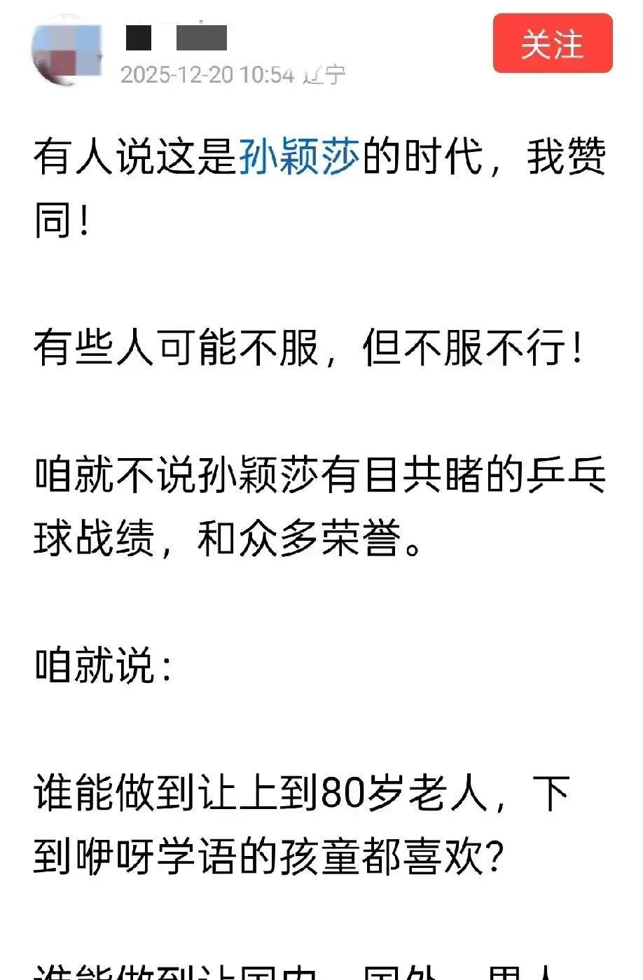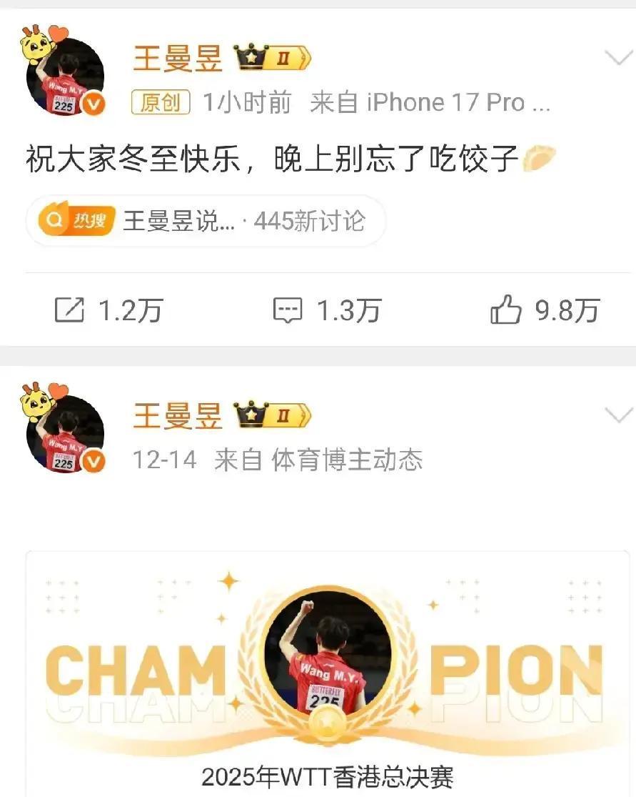 王曼昱又夺冠,热搜却挂“吃饺子”。 她连庆功都懒得发,先提醒粉丝冬至别饿肚子,这宠粉方式真能打。 全运会卫冕冠军+北京大满贯+年终总决赛,硬荣誉一串,钱包厚度藏不住。 有人吵“谁的时代”,我看答案早写她球拍上——只是奥运门票还没轮到她刷。 陈梦时代翻篇,下一章标题:洛杉矶,王曼昱。 先把乒超总决赛收进口袋,明年继续冲!
