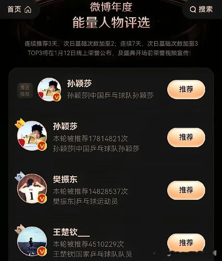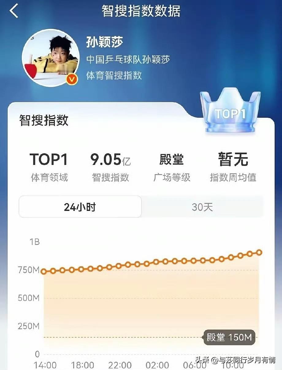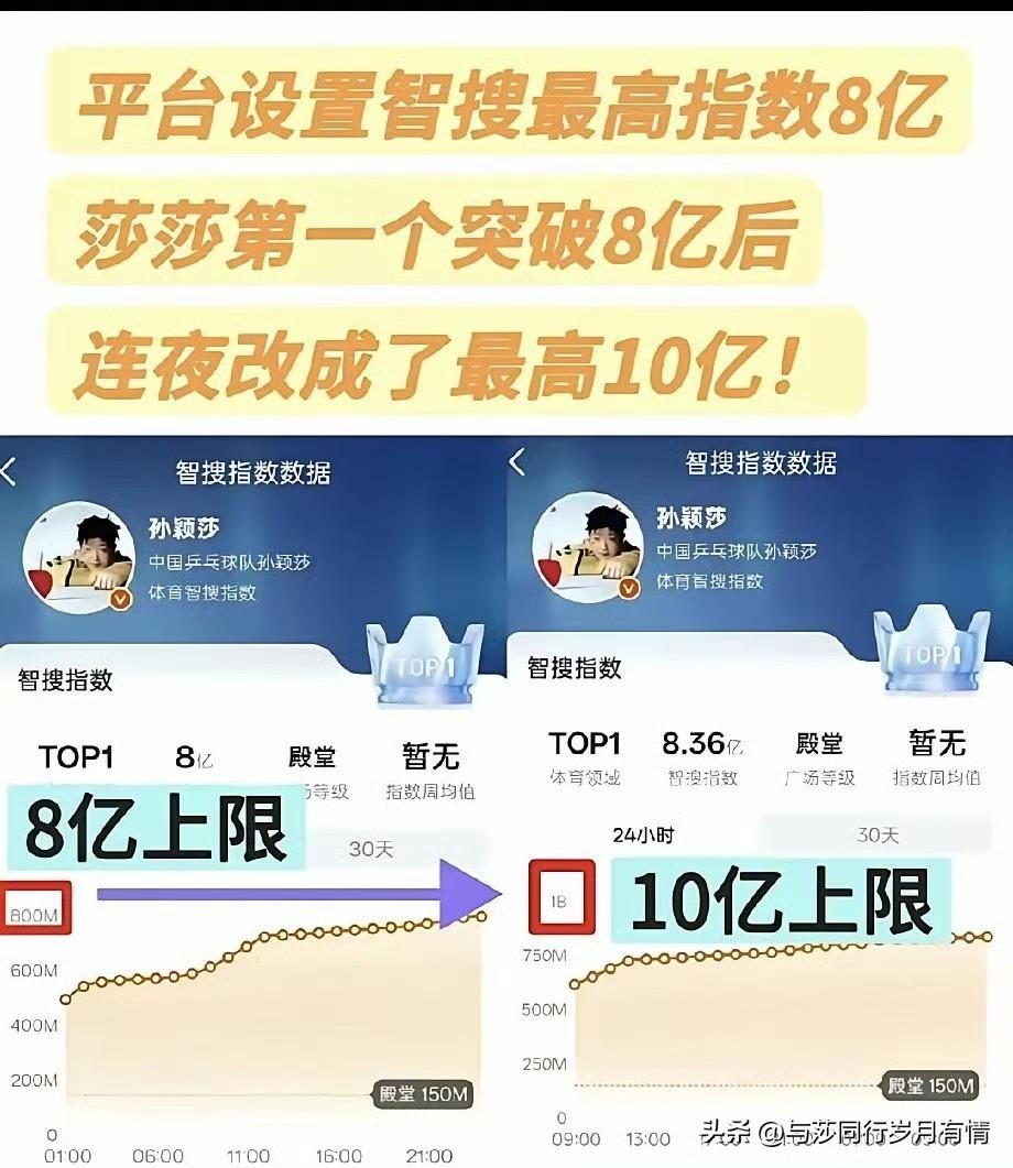 孙颖莎智搜指数破8亿逼平台改规则,粉丝助力冲刺10亿新纪录 孙颖莎的人气到底有多“硬核”?近日某平台的智搜指数数据给出了最直观的答案——原本平台设置的智搜最高指数上限为8亿,而孙颖莎成为首个突破这一数值的运动员后,平台连夜将上限调整至10亿,这波“因一人改规则”的操作,也让网友直呼“莎莎的影响力太能打了”。 从数据界面能清晰看到,孙颖莎的智搜指数先是一路攀升冲破8亿上限,随即平台便把指数峰值更新为10亿,目前她的智搜指数已达到9.05亿,距离新的上限仅一步之遥。 这一连续破纪录的表现,也印证了其数据背后的高关注度与粉丝号召力。 为了助力孙颖莎冲榜,不少粉丝更是拿出十足的行动力:有人重新下载社交平台,用多个账号为她投票;还有人时刻关注指数变化,期待见证她突破10亿的瞬间。 在粉丝眼里,这份数据不仅是数字的攀升,更是对孙颖莎实力与人气的双重认可,而“孙颖莎你真棒”也成了粉丝们最真切的心声。