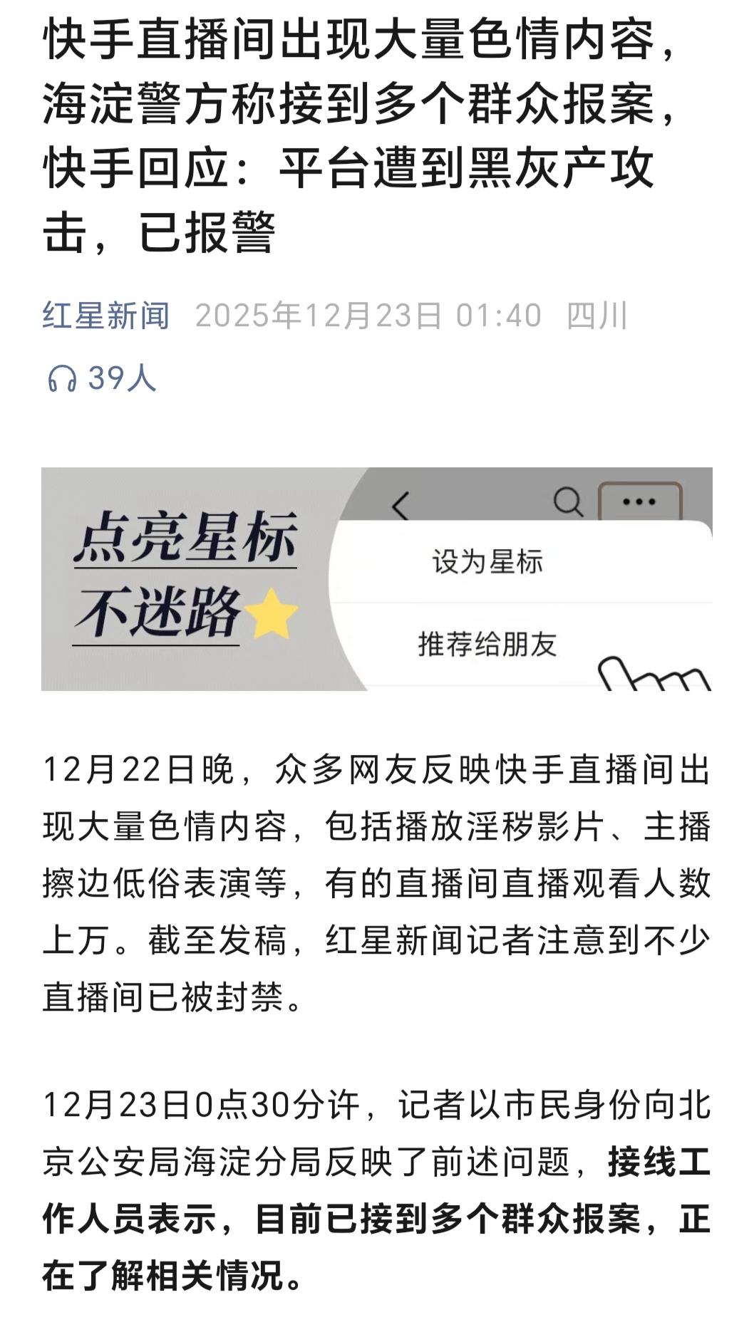 昨晚,快手上演了一出“辣眼睛”的午夜惊魂!不少老铁跟往常一样刷着直播,突然就撞进了“不对劲”的直播间——里头公然播放着淫秽影片,主播打着擦边球进行低俗表演。更让人心惊的是,这种直播间观看人数竟能上万,截图、录屏瞬间在各个社交平台炸开了锅。 一片哗然中,平台开始大批封禁直播间。面对舆论,快手官方随后给出回应,称平台在晚间遭到了“黑灰产攻击”,目前已在紧急修复,并坚决报警处理。北京海淀警方也证实,已接到多起相关报案。 “被黑产攻击”,这个说法听起来平台像是受害者。但这事儿,真能这么简单甩锅吗?一位专注网络法的律师朋友跟我透了底:恐怕不能!根据咱们国家的《网络安全法》等一系列规定,平台对自家地盘上的内容,负有不可推卸的“守门员”责任。这就好比开了一家商场,你得确保里面没人卖违禁品,不能一句“有人偷偷混进来搞破坏”就把自己摘干净。 即便真是黑客恶意突破,这也首先暴露了平台在技术防线和应急反应上存在漏洞。法律讲究过错责任,安全措施没到位、审核机制反应慢,导致有害信息大规模传播,这责任平台难逃。过去不少案例都说明,审核不严的后果很严重,约谈、罚款、整改都是可能的。 事件背后,值得我们深思的更多。对平台来说,追求流量和热度不能以放松安全为代价,信任建立艰难,崩塌却在一瞬间。对咱们普通用户而言,遇到这种内容,别光顾着吃惊或私下传播,第一时间截图举报,才是正确的监督方式。每一个举报,都是在为我们共同的网络环境清污。 那么问题来了:平台一句“被攻击”,你能完全接受吗?除了封号和报警,你觉得平台更该做些什么来挽回信任?来评论区聊聊你的看法吧!