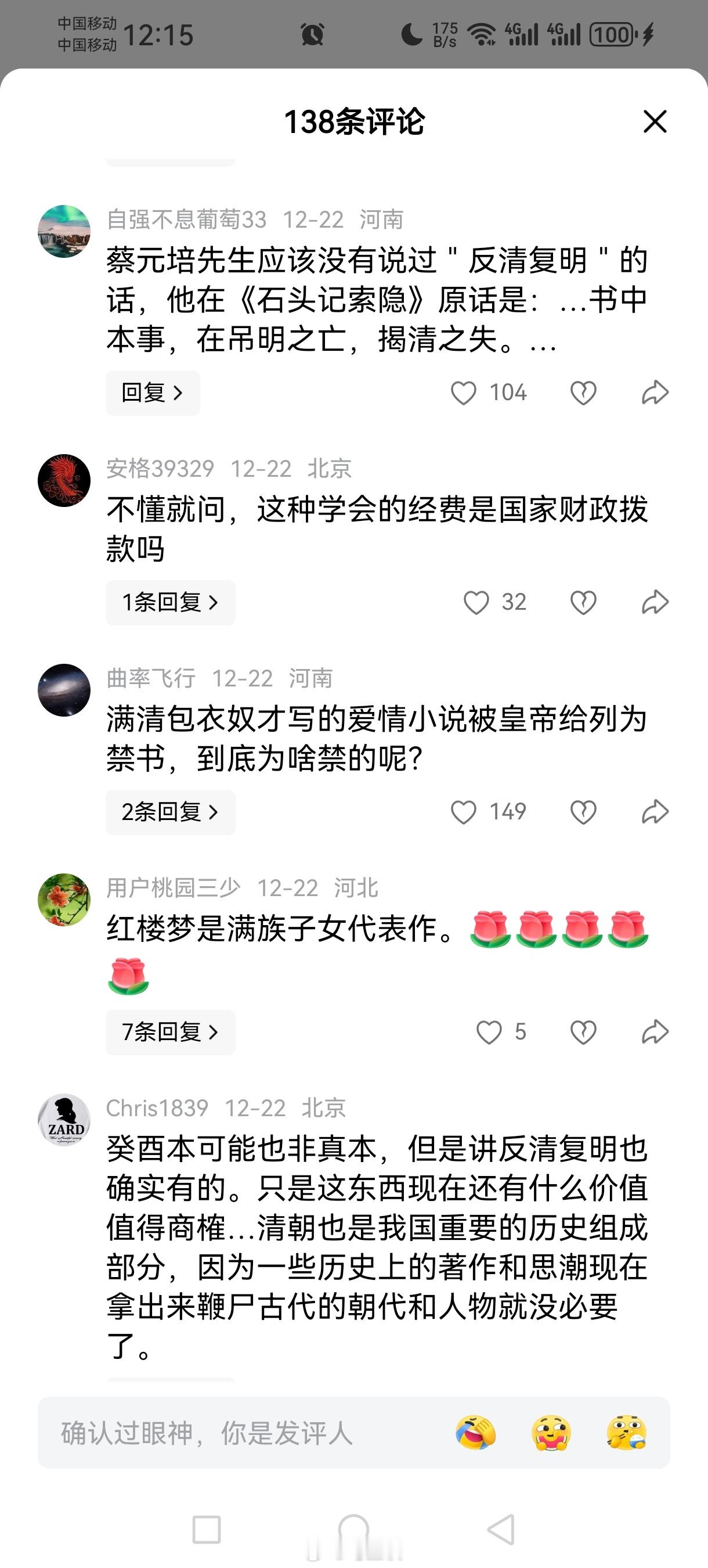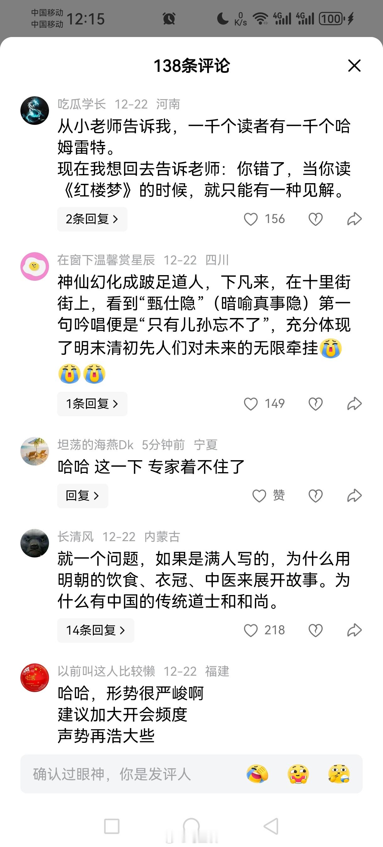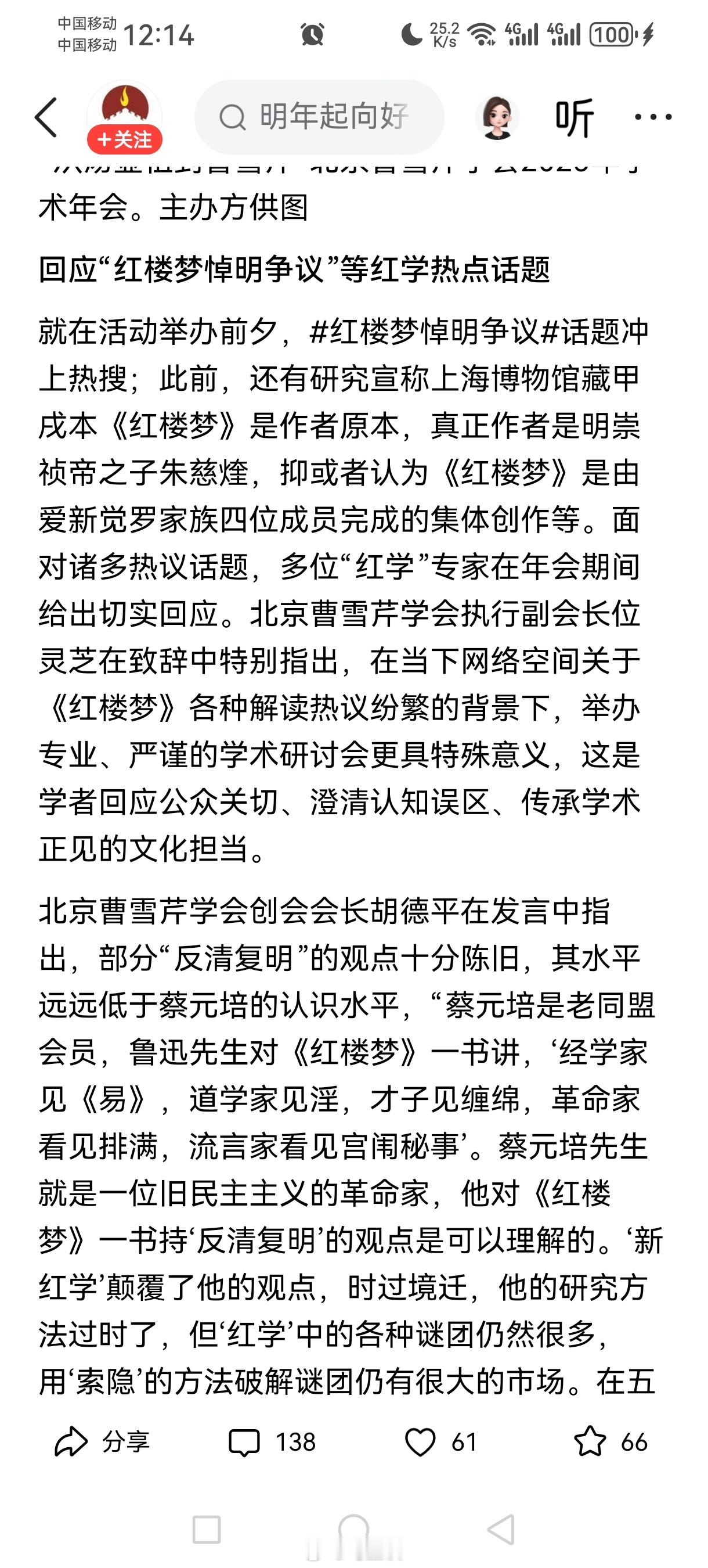 北京曹雪芹学会学术年会召开,回应《红楼梦》“悼明”等争议。看了眼评论区,如今这些“红学专家”再想要蒙蔽读者很难了,这就是全民开智的好处。红楼梦悼明争议