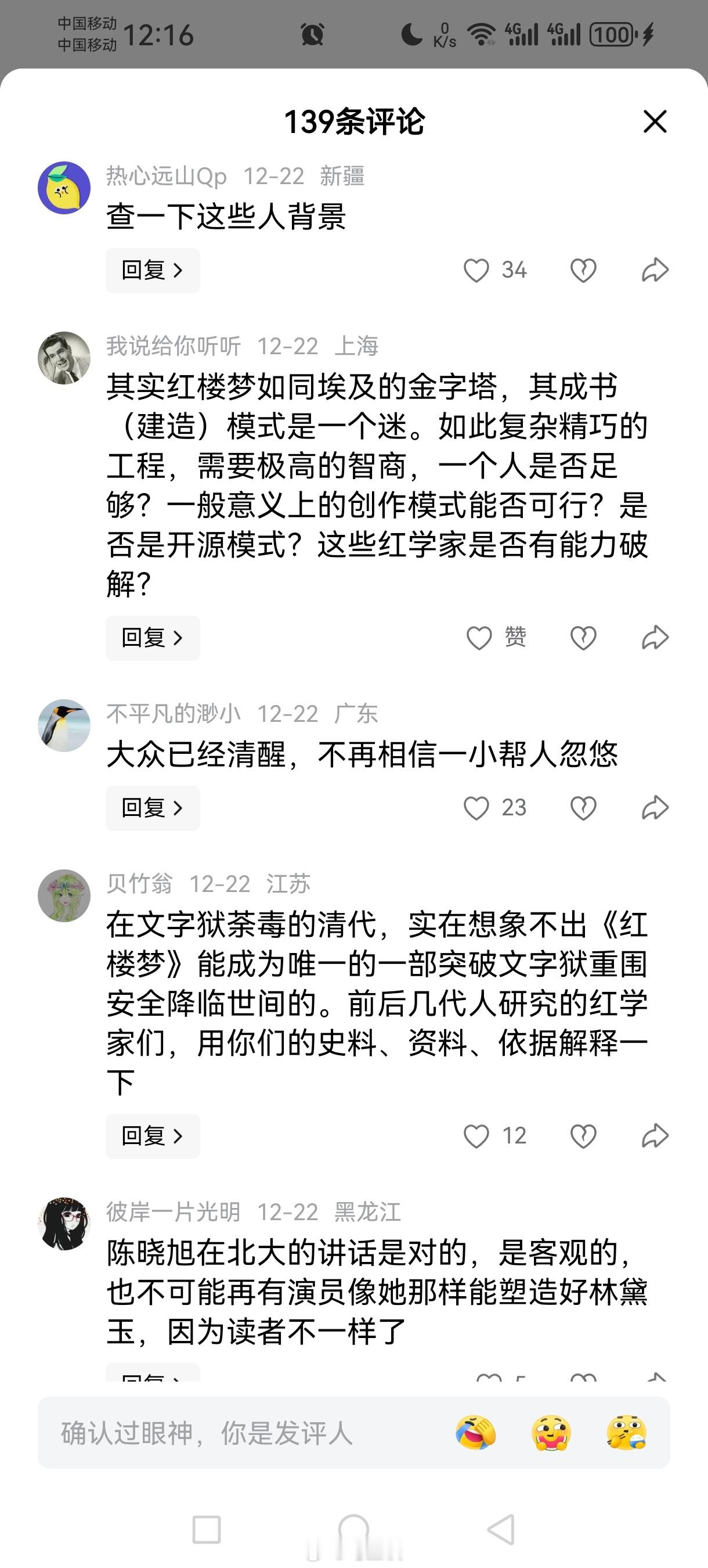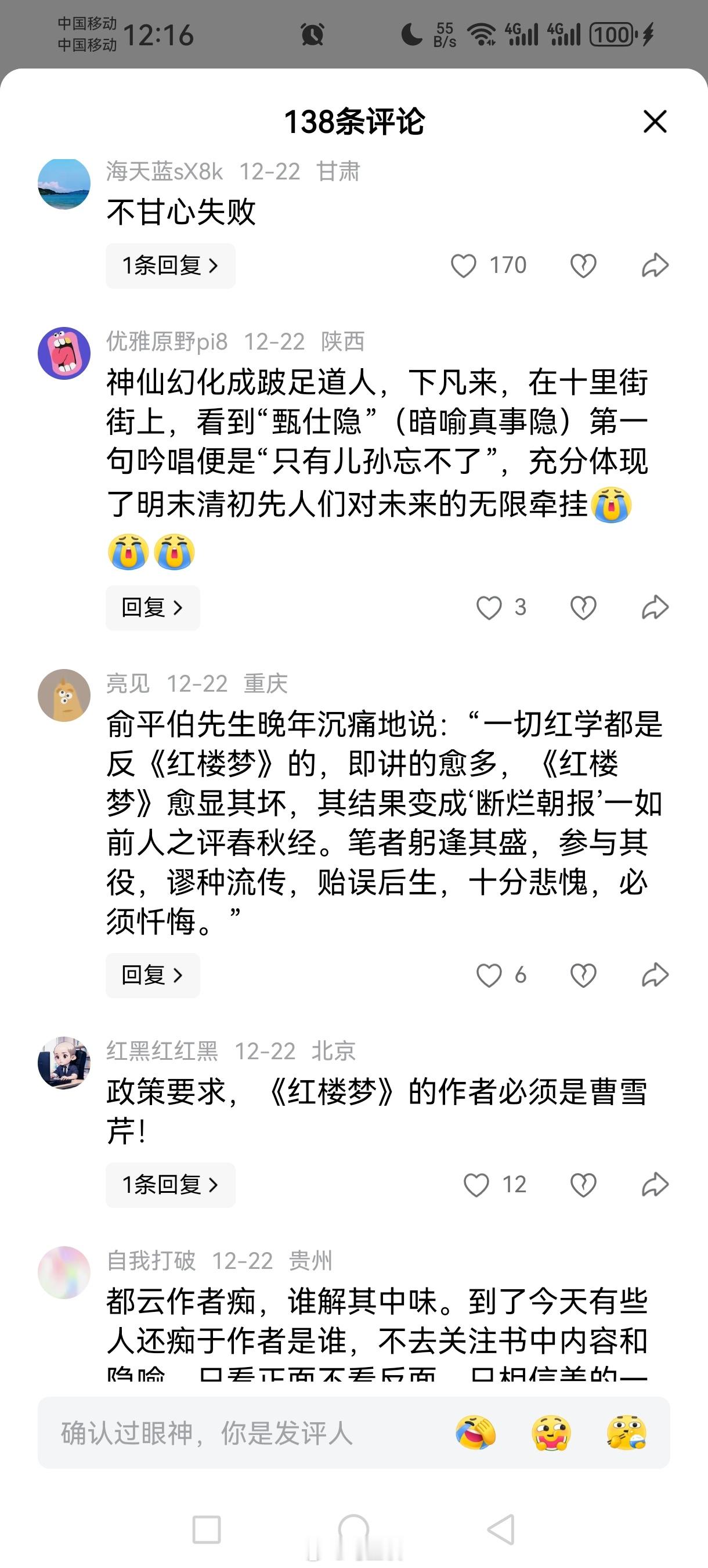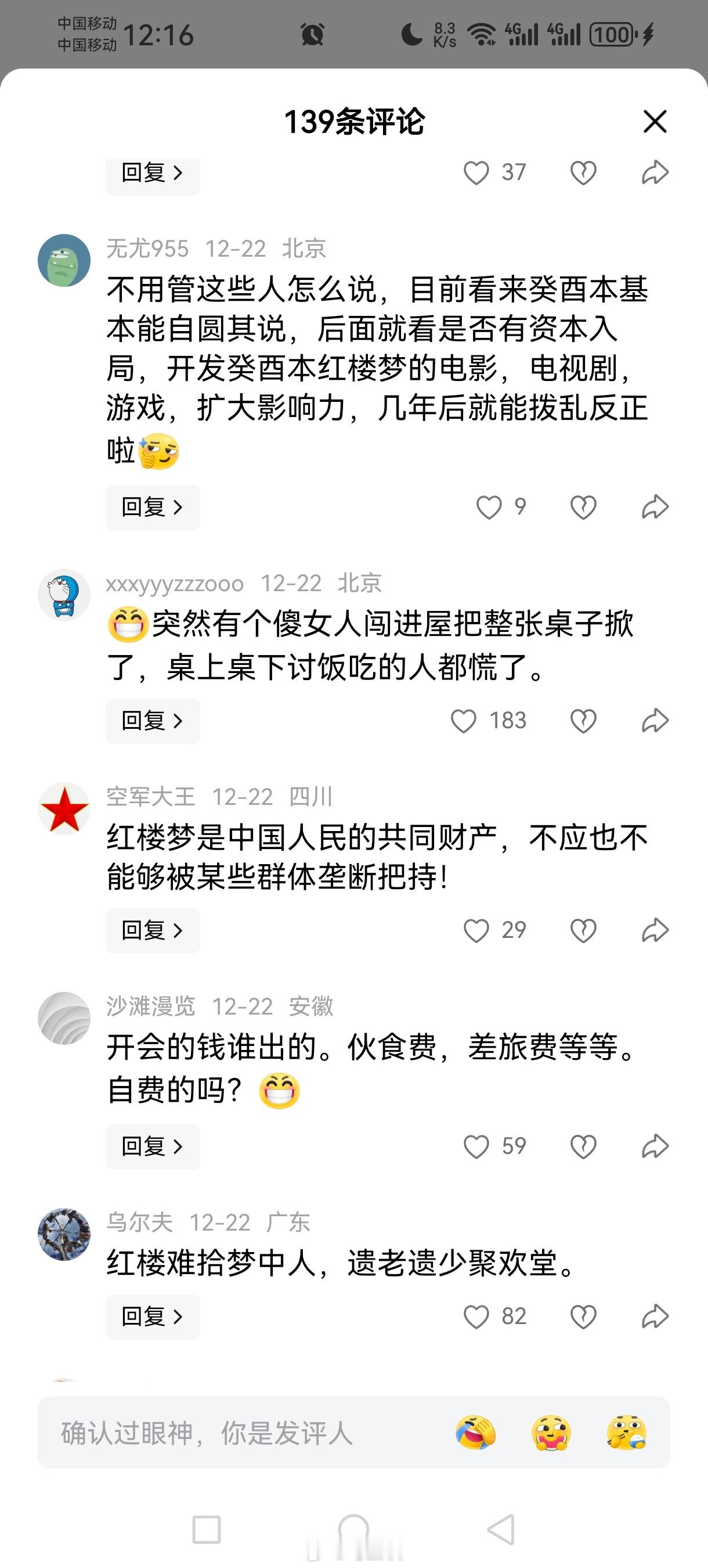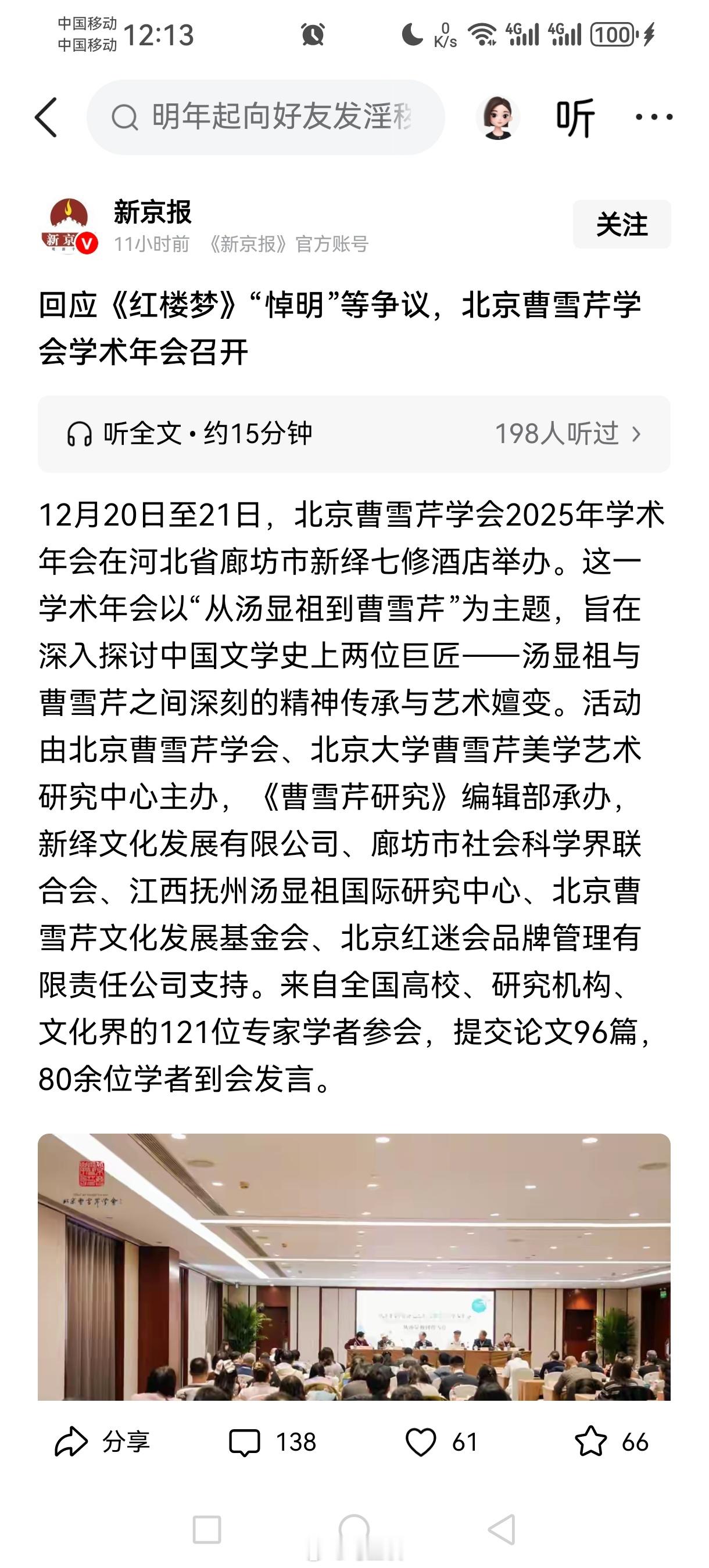 北京曹雪芹学会学术年会召开,回应《红楼梦》“悼明”等争议。看了眼评论区,如今这些“红学专家”再想要蒙蔽读者很难了,这就是全民开智的好处。红楼梦悼明争议