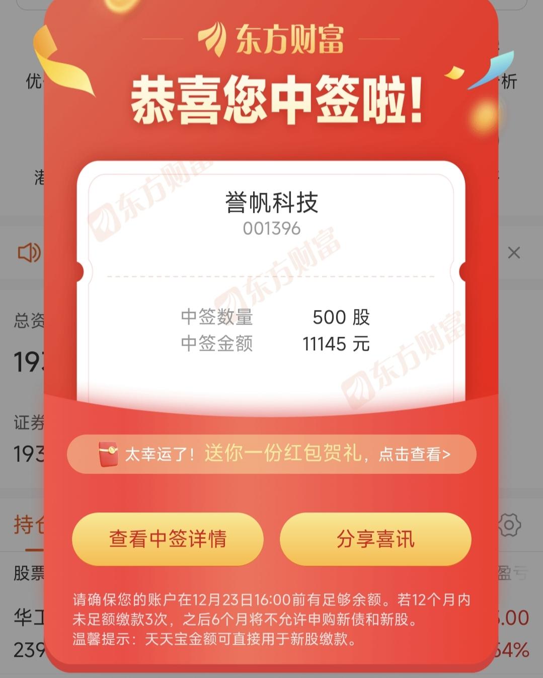 太幸运了!居然中签了誉帆科技。2025年12月22日公布的中签号,总共约3.53万个,我就是其中之一。每个中签号能认购500股它的A股股票。 看着那些中签号码,像末“4”位数1237,末“5”位数06866之类的,感觉中签真像一场奇妙的缘分。不知道这只股票上市后表现咋样,希望能给我带来一笔不错的收益。身边好多人打新一直没中,我这运气突然爆棚,想想还有点小激动,坐等后续的好消息啦。 中签股上市 A股投资生态正在发生什么改变 你觉得A股现在适合入场吗 今年你中签了几个新股