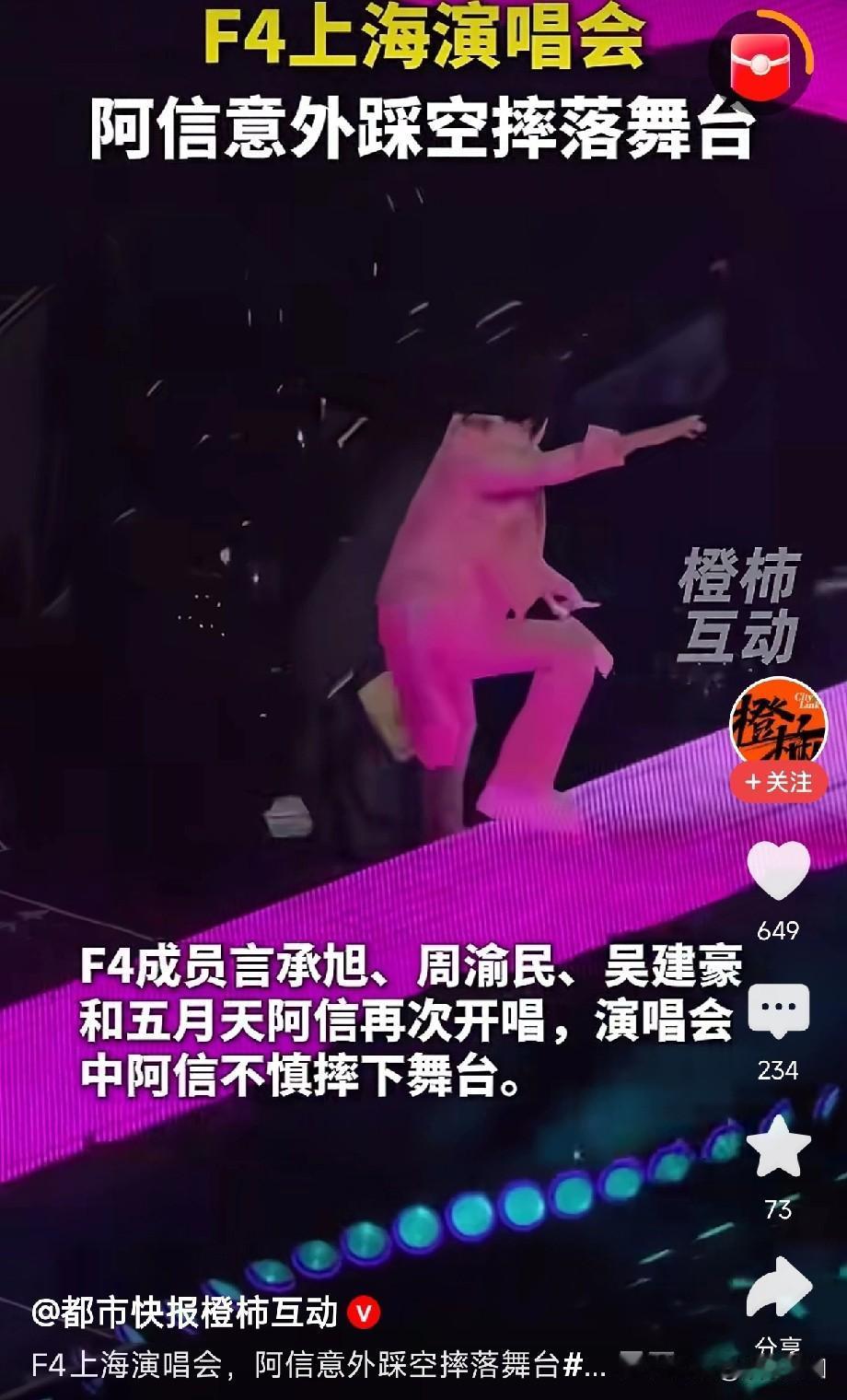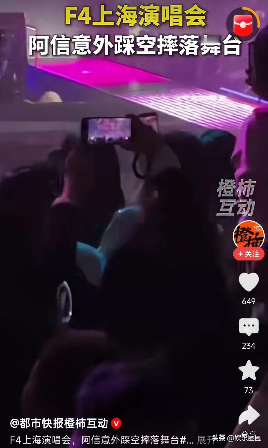 12月22日晚,由言承旭、周渝民、吴建豪和阿信共同举办的“F★FOREVER恒星之城巡回演唱会 - 上海站”迎来了上海站的最后一场演出。 原本这场演出即将圆满落幕,然而阿信却不慎摔下舞台。所幸他受伤并不严重,稍作调整后便继续完成了表演,演出结束后被送往医院。 唉,似乎有演唱会就总有意外发生,如今的承办方是不是该对此予以重视了?别再让黄家驹这样的悲剧重演! 言承旭演唱会
