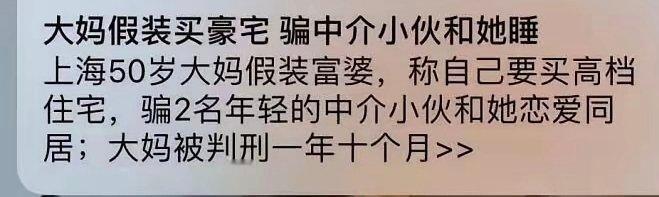 上海大妈诈骗年轻中介被判刑1年10个月这事以前就有新闻,但是现在走偏了,诈骗钱财的主题没了。50多岁的女子谎称自己是富商遗孀,要买豪宅,与多名房产中介人员交往发生关系。到这步其实不会判刑,甚至没人会告。关键是,女子编造各种理由索要钱财。这导致事发,因诈骗罪被判刑1年10个月。最近明显的转变是,男性部门对女性部门转移支付大幅下降。不知道是好还是坏,感觉可能偏利好。理论上,男性部门应该转移支付给愿意生育的女性部门。现在一些男性好不容易存了些钱,建议谈的时候加入生育条款,不要梭哈。