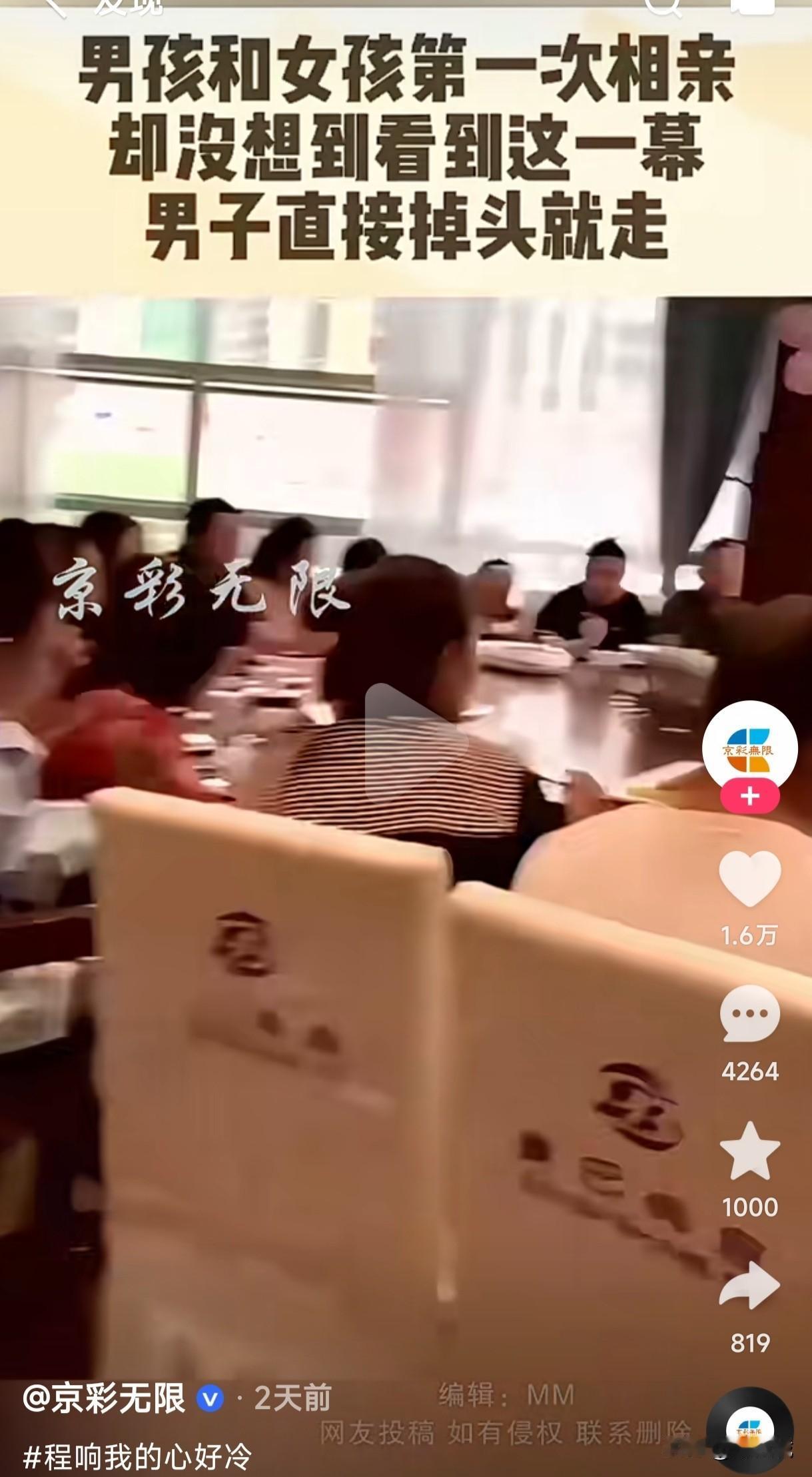 女子和男子第一次相亲,没想到男子赶到饭店后看到女子带了一群亲戚朋友已经开吃了,男子二话没说直接转头就走。 这到底是两个人相亲的?还是女子借着相亲的名义故意宰男子一回?难道这一大桌子都是女子的父亲母亲吗?她带这么多人是来帮自己把关的吗还是专门来蹭吃蹭喝的?这一大桌子菜是不是要好几千块钱了?相亲本该是两个人的事,这女子带这么多人不知道想干什么?而且就算一起吃饭不是应该等一下男子吗?这他们倒先吃起来了,这是不是有点太不尊重人了,遇到这样的人不扭头就走难道还等着当冤大头吗? 这真是林子大了什么鸟都有,哪里有第一次相亲见面带这么多人的,这是来相亲的吗?俗话说物以类聚人以群分,这女子带了这么大一群人都是没见过世面不懂分寸的人吗?女子不懂事也就算了,难道这些人里面就没有一个明事理的吗?相亲 相亲方式